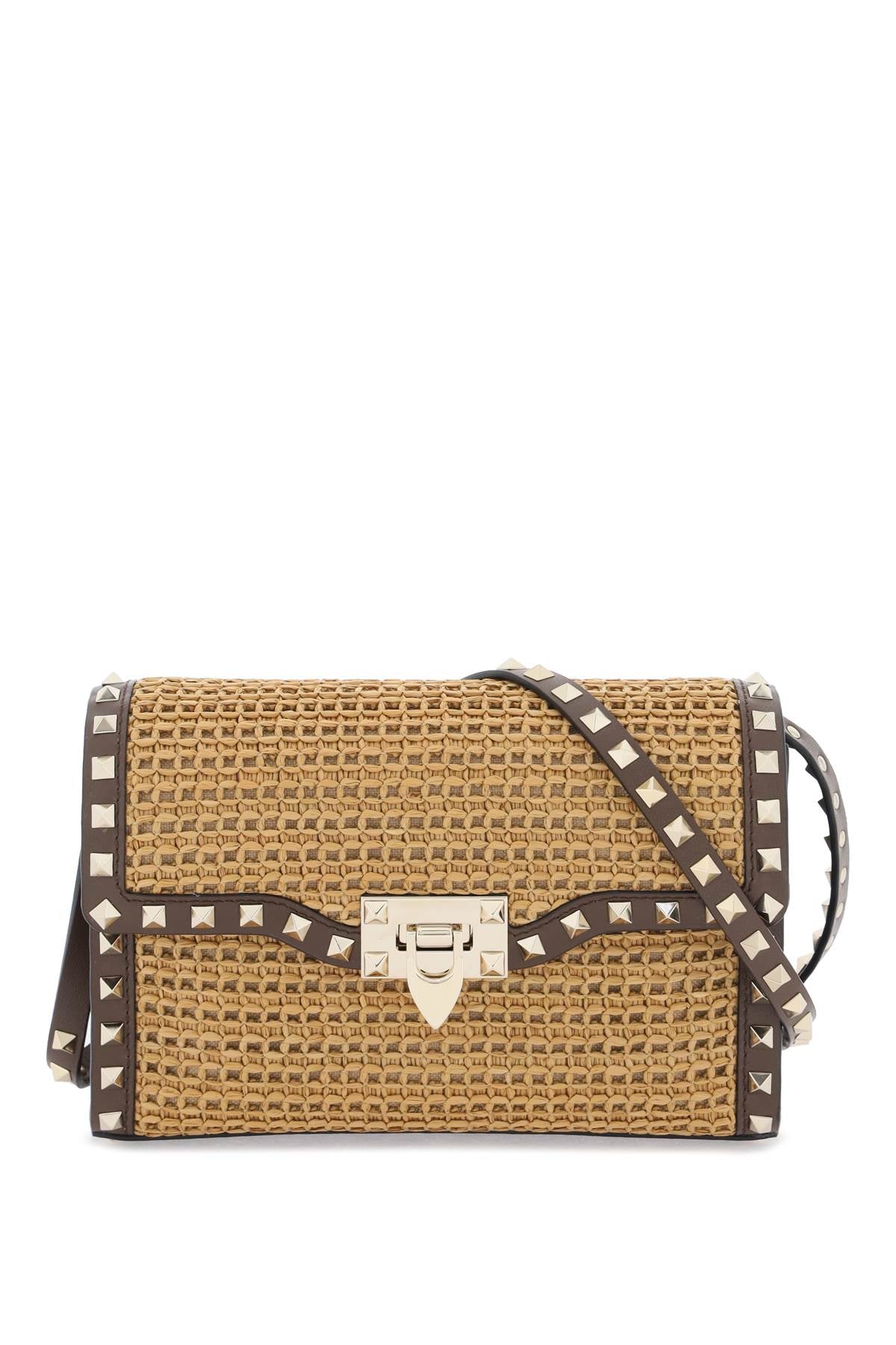 Valentino Garavani small Rockstud bag in woven synthetic raffia with leather trim embellished with iconic metals studs. Removable and adjustable studded shoulder strap, flap with hook closure. Synthetic raffia fabric-lined interior with a patch leather pocket. Gold-tone logo print on the back, platinum-finished metalware. Bag Length = 23 cm, Bag Height = 15 cm, Shoulder Bag Length = 120 cm,