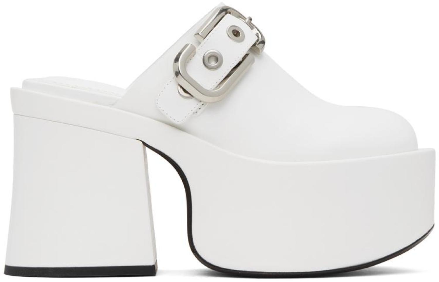Marc Jacobs White 'The J Marc Leather' Mules Buffed leather mules in white. · Pin-buckle strap at vamp · Padded leather footbed · Grained leather lining · Covered block heel with rubber injection · Covered platform midsole · Leather sole · Platform: H2.5" · Heel: H3.75" Supplier color: White Leather. Made in China. 241190F122004