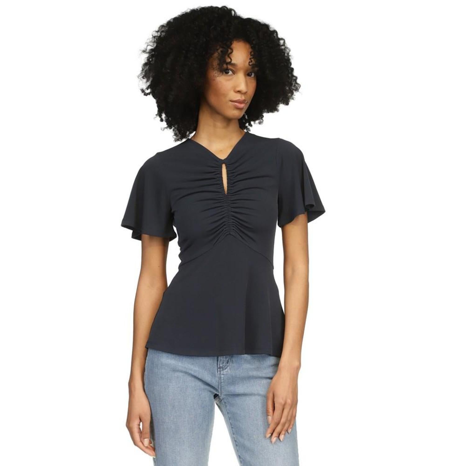 Unlock of chic look with this flutter-sleeve top from MICHAEL Michael Kors, featuring a ruched front. Approx. 24-1/2" long V-neck with keyhole Ruched at front Flutter sleeves Polyester/elastase Machine washable Imported