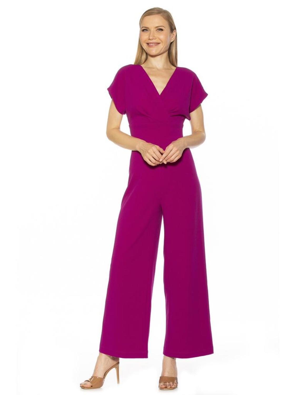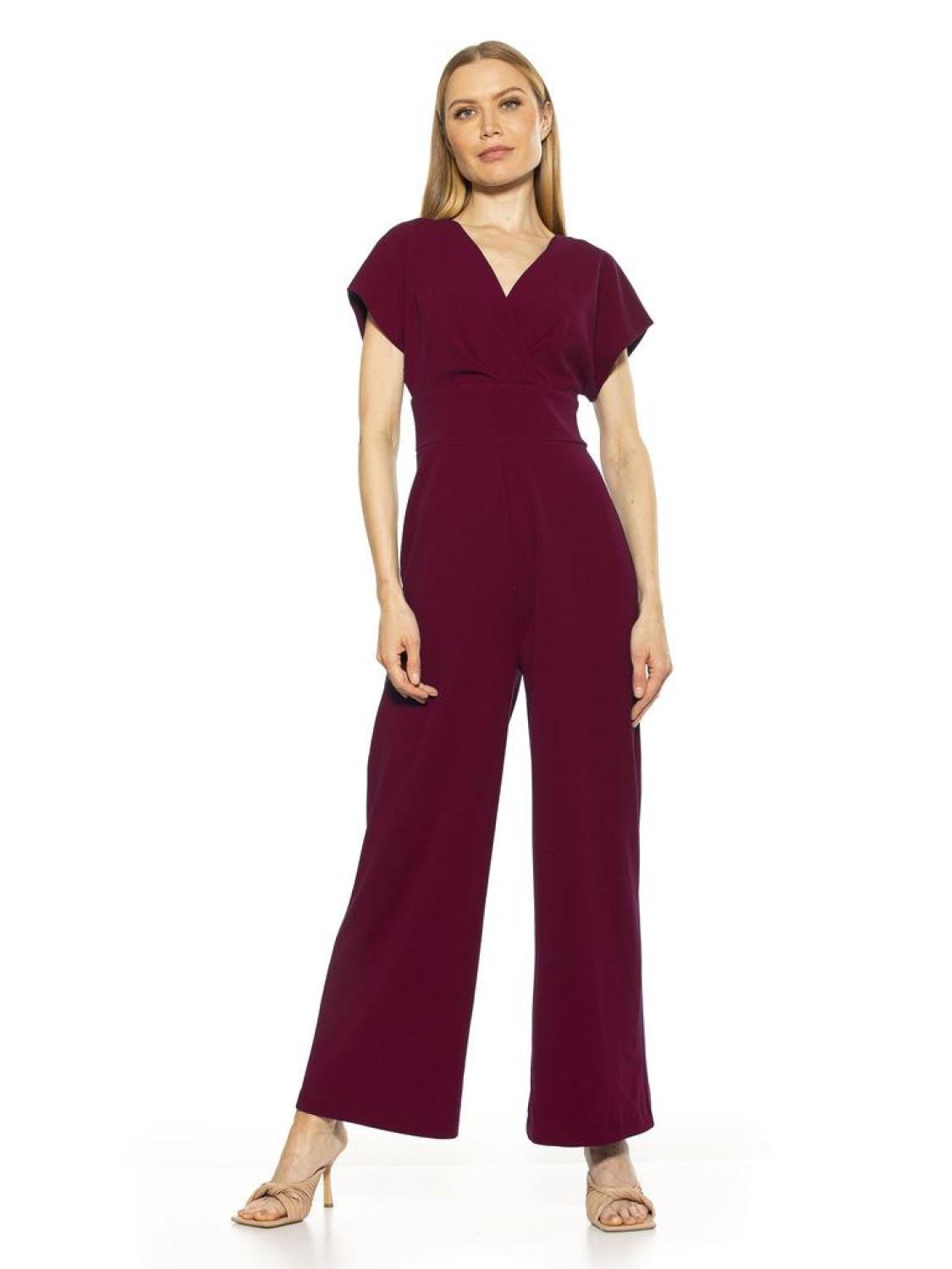 PRODUCT FEATURES Surplice neckline Short sleeves Concealed back zip Draped bodice Banded waist Lined - 100% Polyester 95% Polyester, 5% Spandex Machine wash Imported Style D3846