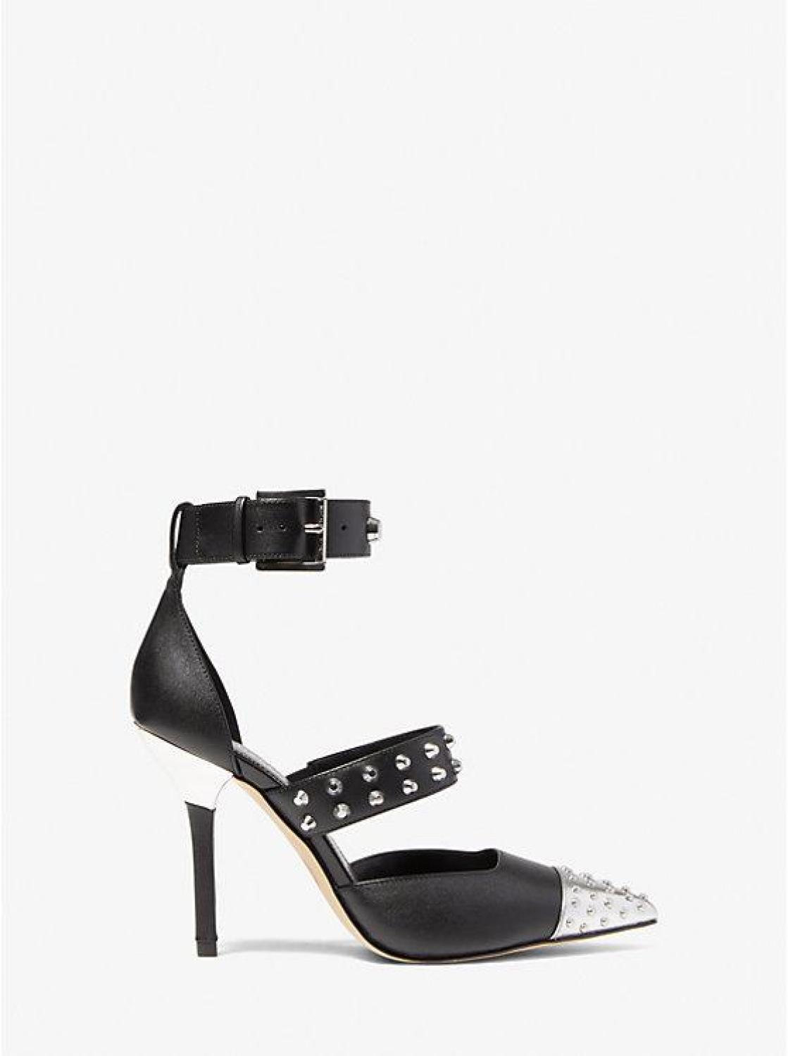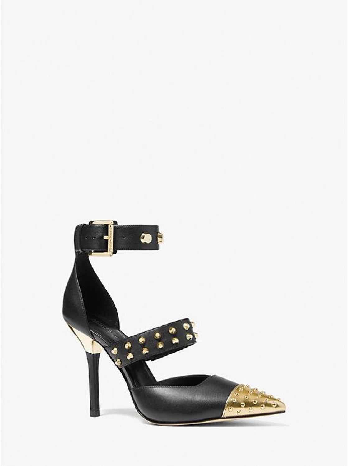 Our Amal pumps are topped with Astor studs that give the multi-strap leather design a chic edge. The gold-tone-topped heel and toe cap and buckled strap add to the polished effect. Keep yours in focus with a leg-baring skirt or dress. • Sandal • Polyurethane blend • 75% polyurethane/25% polyester • Lining: polyurethane blend • Sole: rubber • Point toe • Buckle fastening • Heel height: 4” • Heel type: stacked • Imported • Sandal • Polyurethane blend • 75% polyurethane/25% polyester • Lining: polyurethane blend • Sole: rubber • Point toe • Buckle fastening • Heel height: 4” • Heel type: stacked • Imported