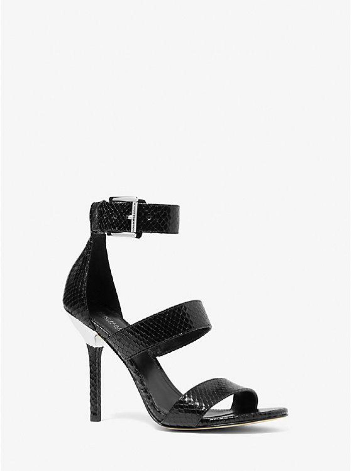 Our leather Amal sandals are defined by a snake-embossed finish that lend the multi-strap design an exotic edge. The silver-topped heel and buckled strap add a hint of shine to each step. Keep yours in focus with a leg-baring skirt or dress. Sandal Snake embossed leather 100% leather from tanneries meeting the highest standards of environmental performance Lining: polyurethane blend Sole: rubber Open toe Buckle fastening Heel height: 4” Heel type: wrapped Imported Sandal Snake embossed leather 100% leather from tanneries meeting the highest standards of environmental performance Lining: polyurethane blend Sole: rubber Open toe Buckle fastening Heel height: 4” Heel type: wrapped Imported