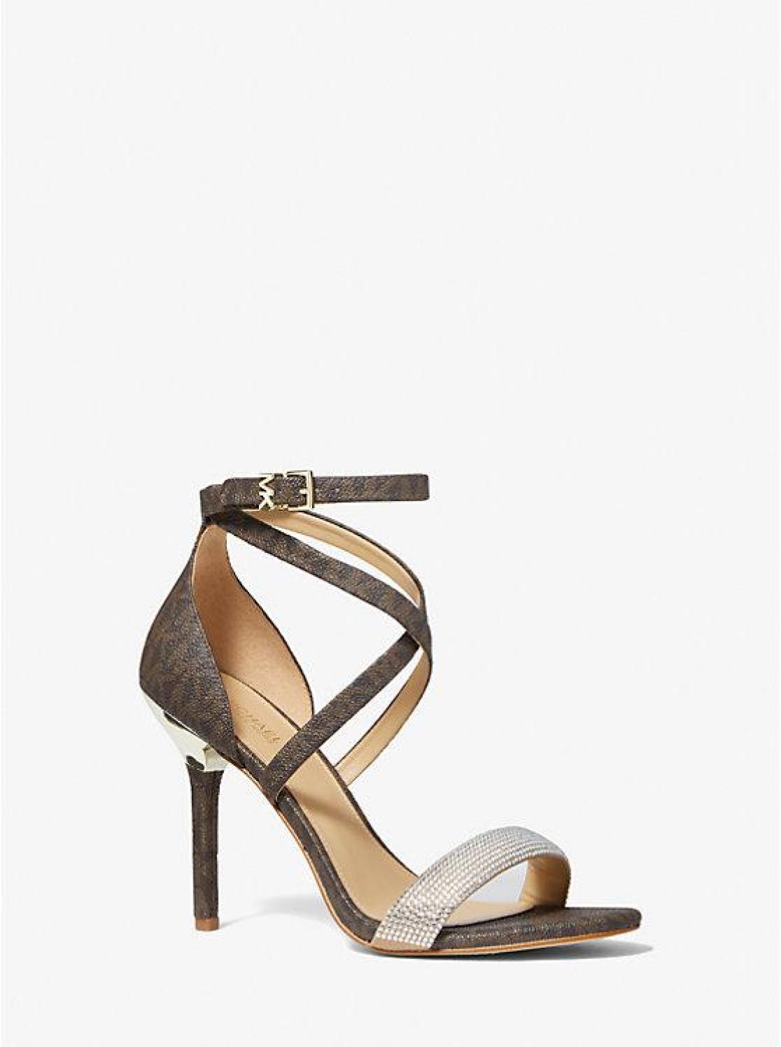 • Embellished to perfection, our Astrid sandal will have you treading brightly at your next soirée. This logo-print canvas pair is defined by sparkling crystal embellishments and crossover straps that beautifully frame the foot. While the styling options are endless, we think they’re best reserved for a special night out.