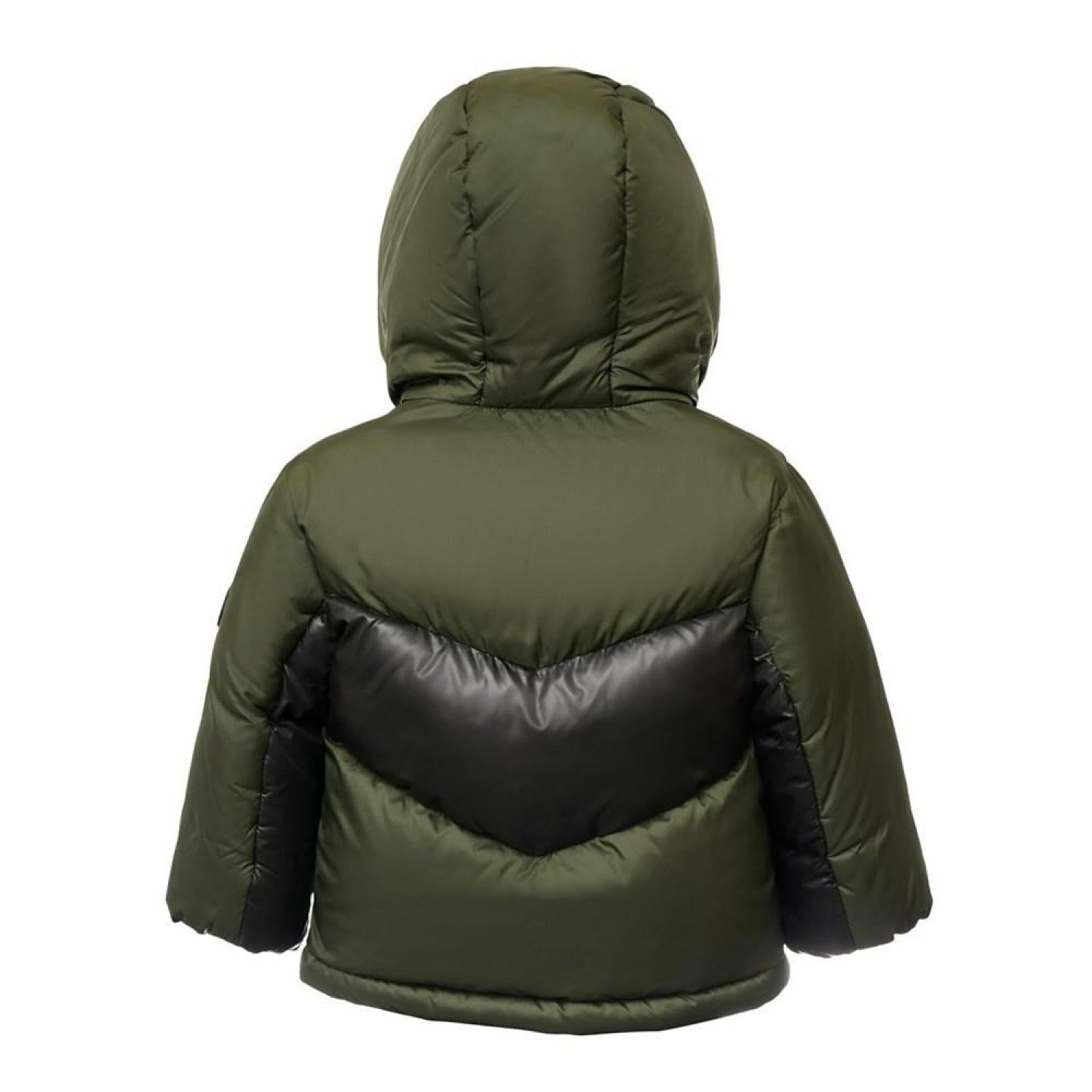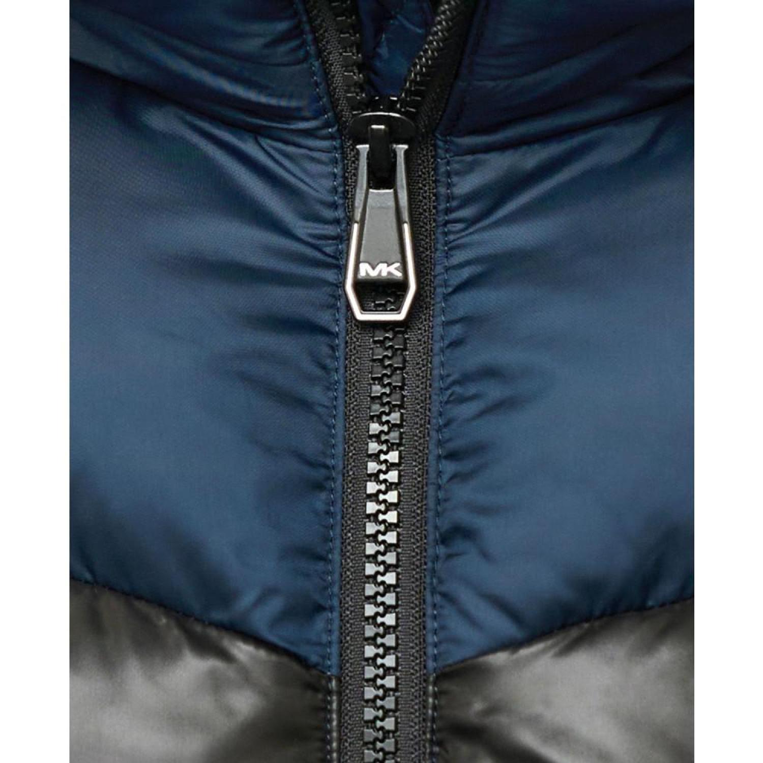 • Infant boy heavy weight chevron stripe puffer jacket with fleece lining and Michael Kors logo zipper pull and rubber arm patch.