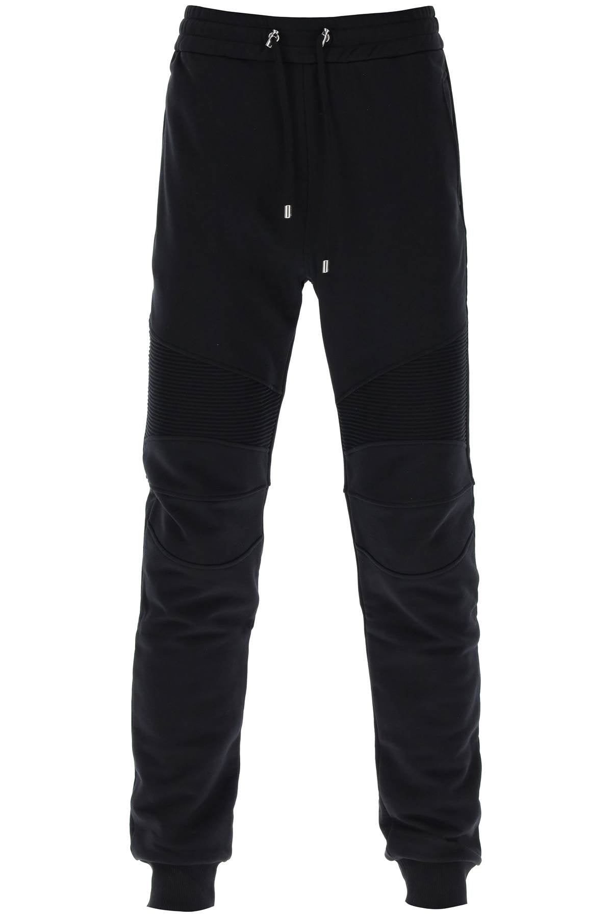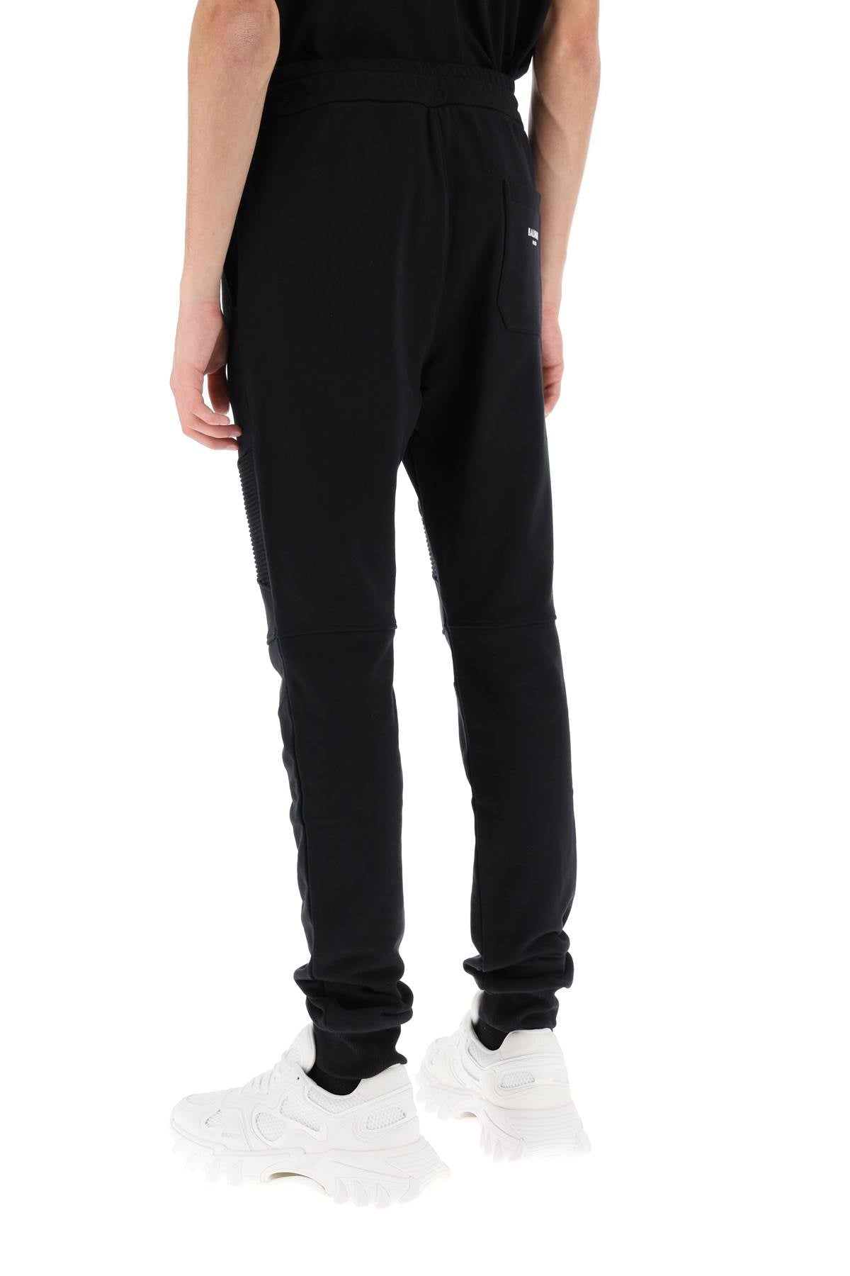 • Balmain joggers crafted in pure cotton french terry, characterized by a tapered slim cut. They feature elasticated waistband with drawstring, side squared pockets, a back patch pocket embellished with flocked logo, topstitched inserts at knees and hem with elasticated cuffs. The model is 187 cm tall and wears size L.
