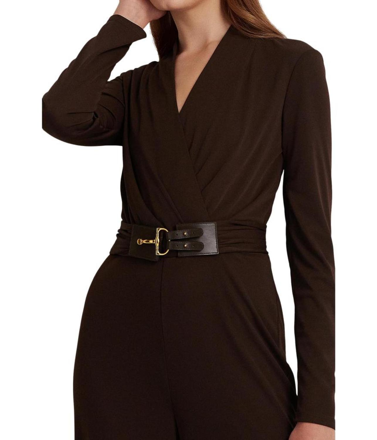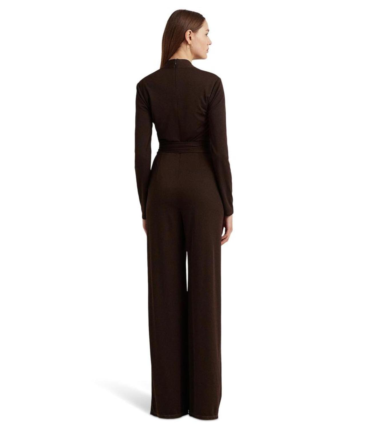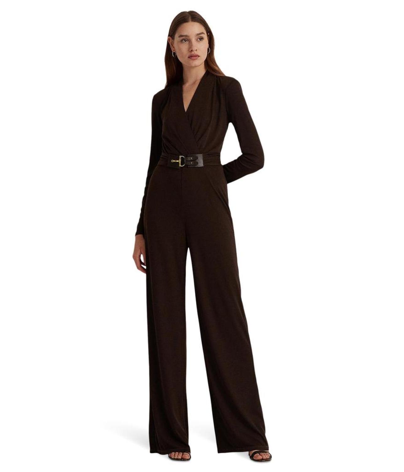 Look like a diva in the chic and modern comfort of the LAUREN Ralph Lauren® Belted Jersey Surplice Jumpsuit with surplice neckline and long sleeves.