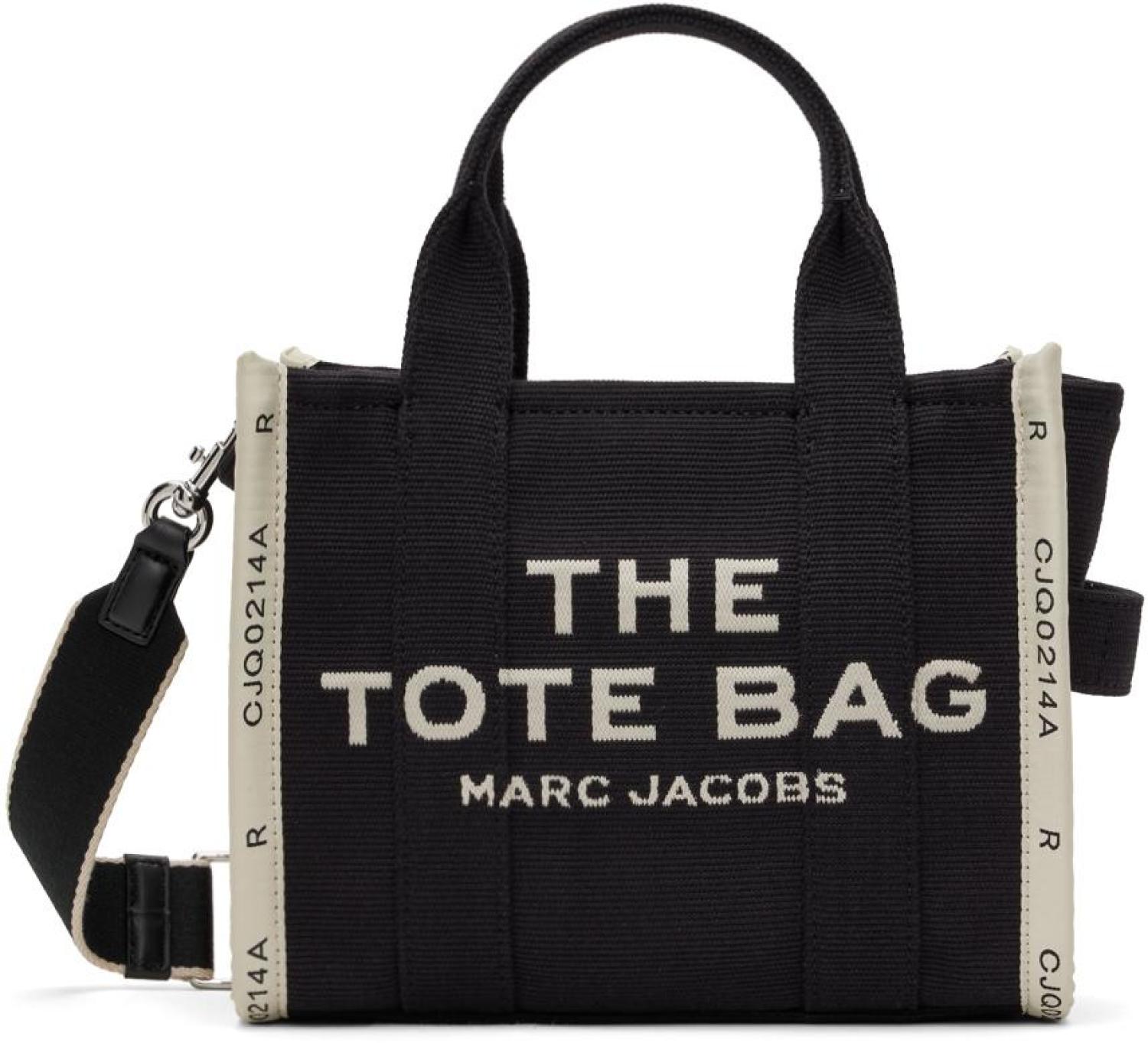 Marc Jacobs Black 'The Jacquard Small' Tote Canvas tote in black. Text-woven twill trim in off-white throughout. · Twin rolled carry handles · Adjustable and detachable shoulder strap · Jacquard logo and text at face · Logo patch at back face · Zip closure · Unlined · H8 x W10 x D4 in Supplier color: Black Textile. Made in Viet Nam. 232190F049106