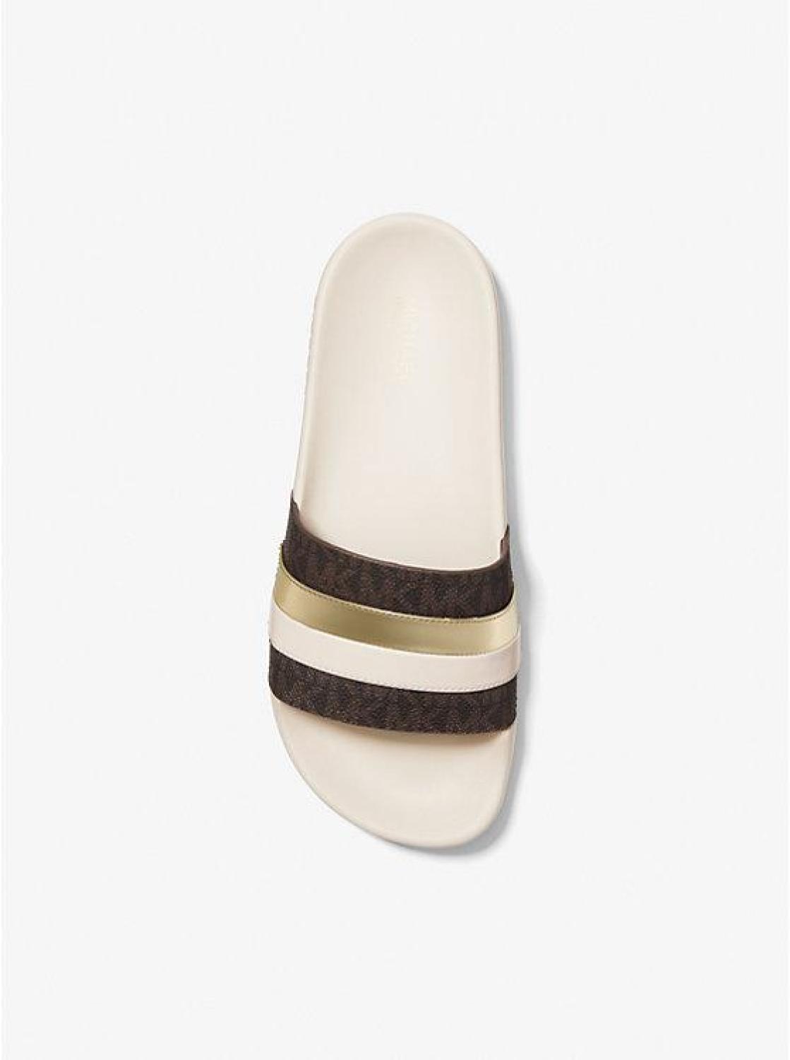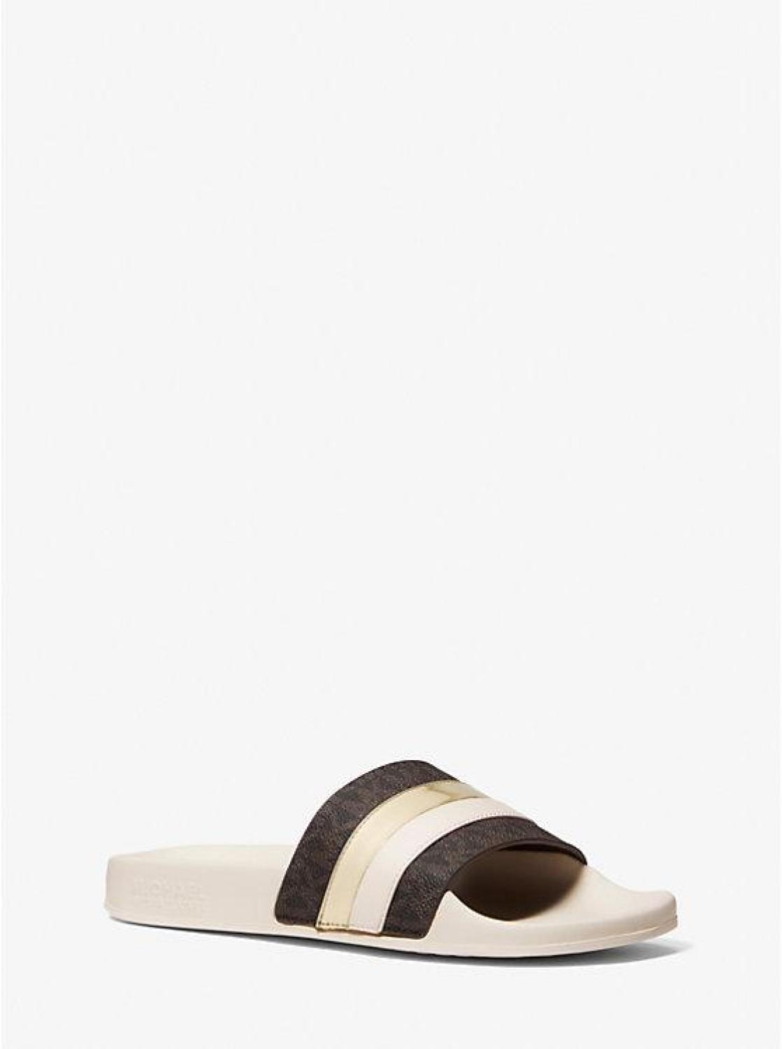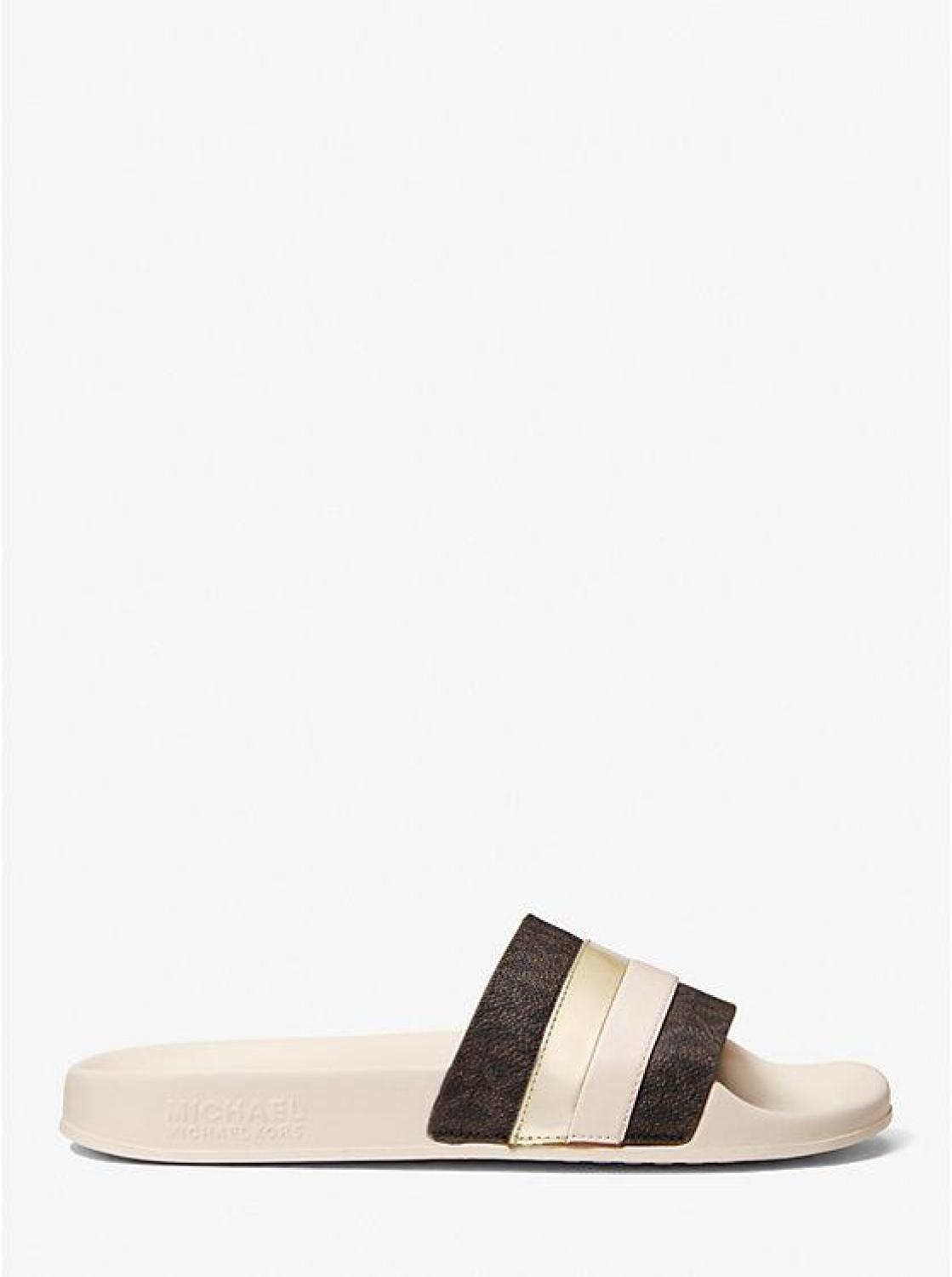 Our Brandy slide sandals will elevate looks from leisurely to luxe. Signature-print canvas combines with smooth and metallic accents for statement-making effect, while a molded footbed provides day-long comfort. Wear them with casual-cool separates on the weekend. Slide sandal Logo-print canvas 89.4% coated canvas/9.6% polyester/1% polyurethane Sole: rubber Open toe Slip on Imported Slide sandal Logo-print canvas 89.4% coated canvas/9.6% polyester/1% polyurethane Sole: rubber Open toe Slip on Imported