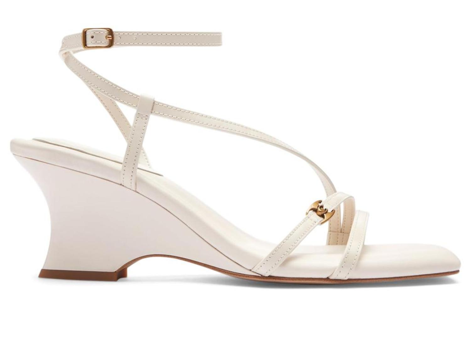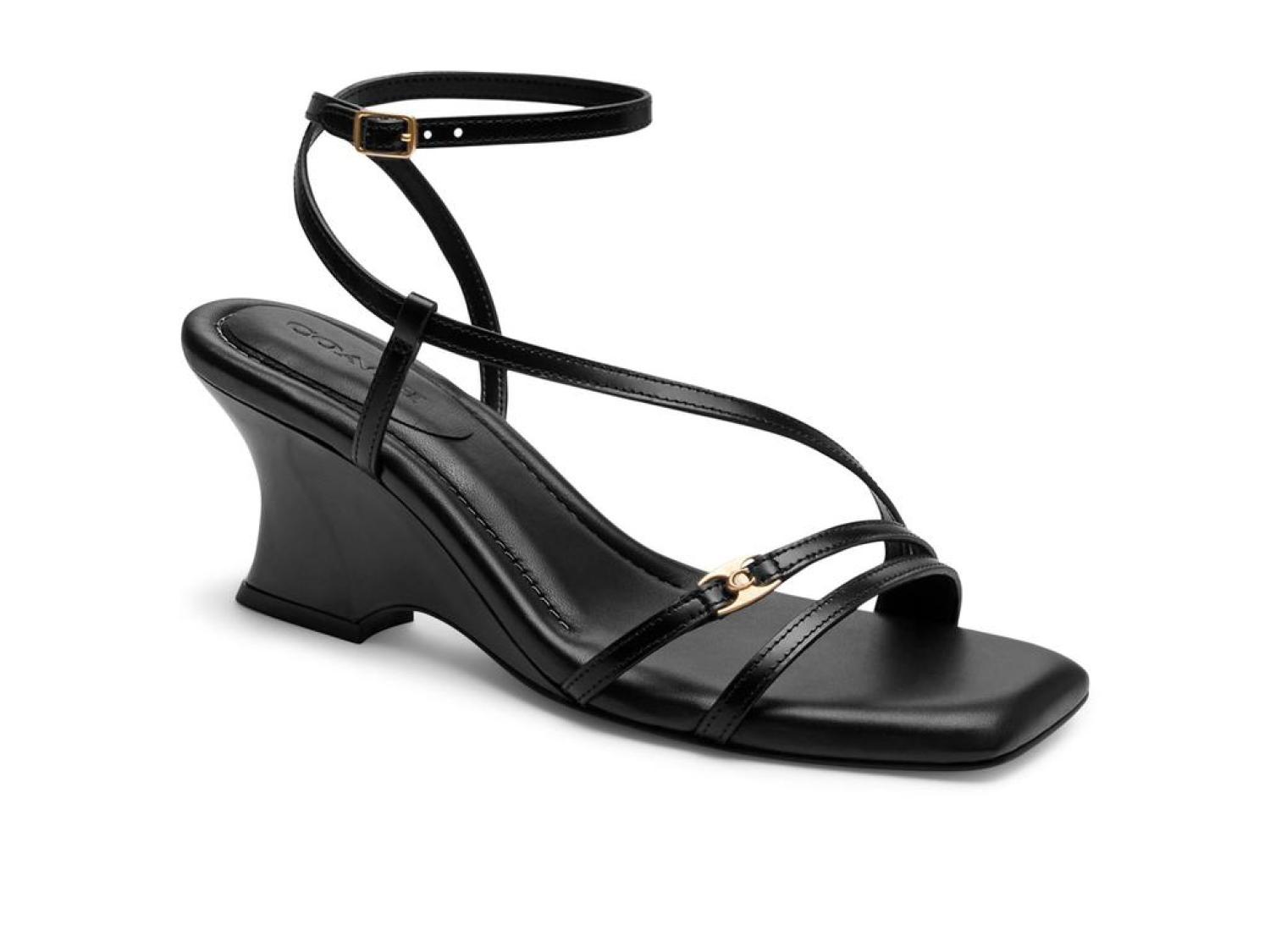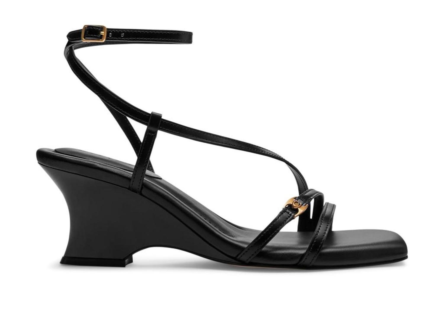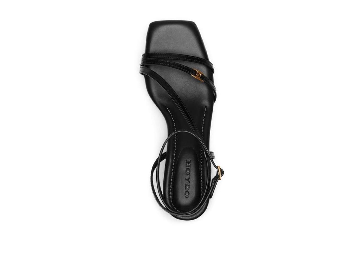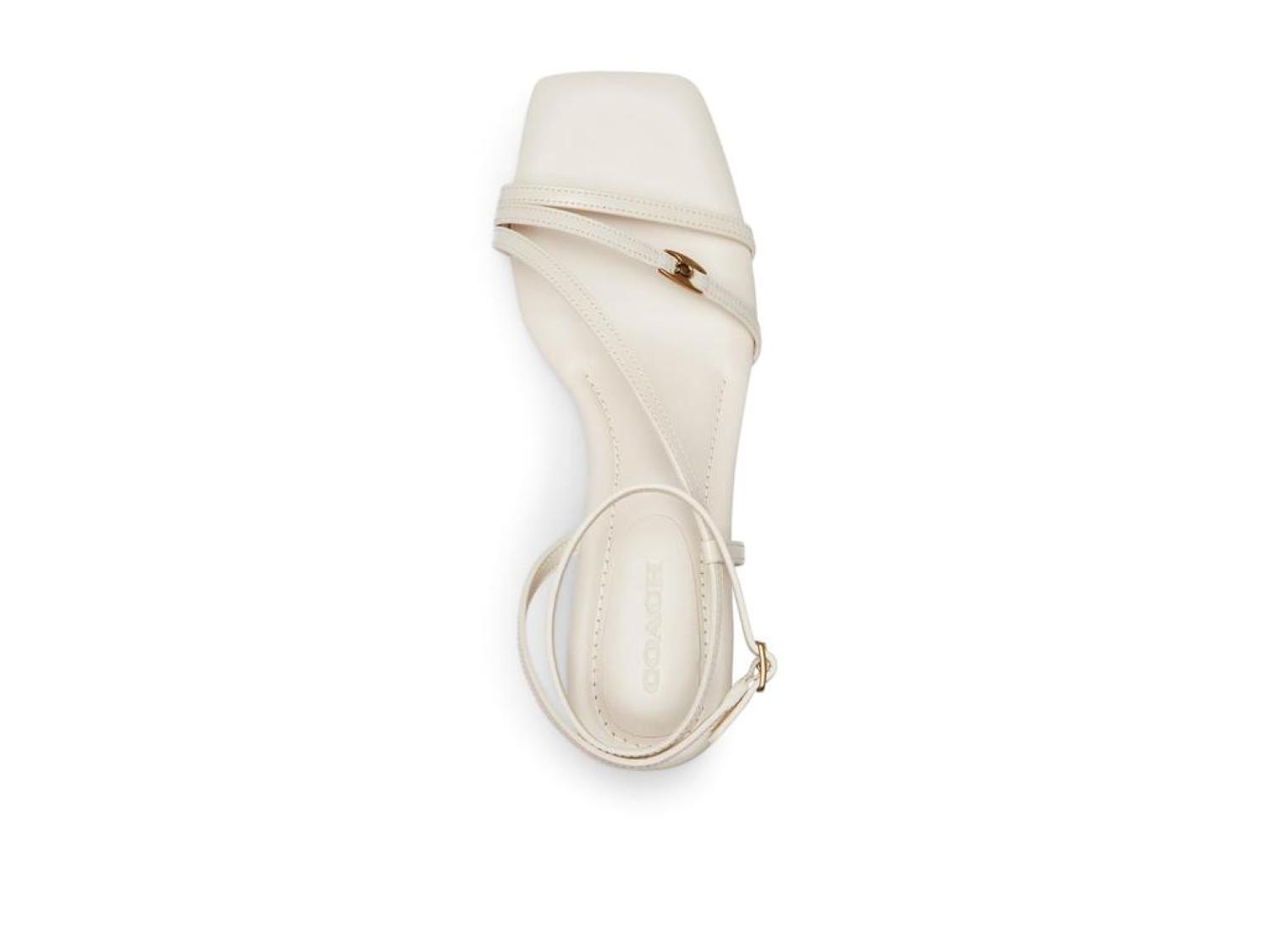 Please Note: COACH™ items cannot be shipped to military addresses (APO or FPO) and addresses in Hawaii, the Virgin Islands, Guam or any other locations outside of the continental US. Boasting a minimalist style with an open square toe, slender upper straps, and a sculpted wedge heel, the COACH® Cait Sandals are all set to make you the showstopper. These are constructed with a leather upper featuring a signature logo accent on the vamp strap and an adjustable buckle closure on the ankle strap, a soft man-made leather lining, and a padded leather footbed. Man-made leather outsole. Imported. Product measurements were taken using size 7, width B - Medium. Please note that measurements may vary by size. Measurements: Heel Height: 2 1/2 in