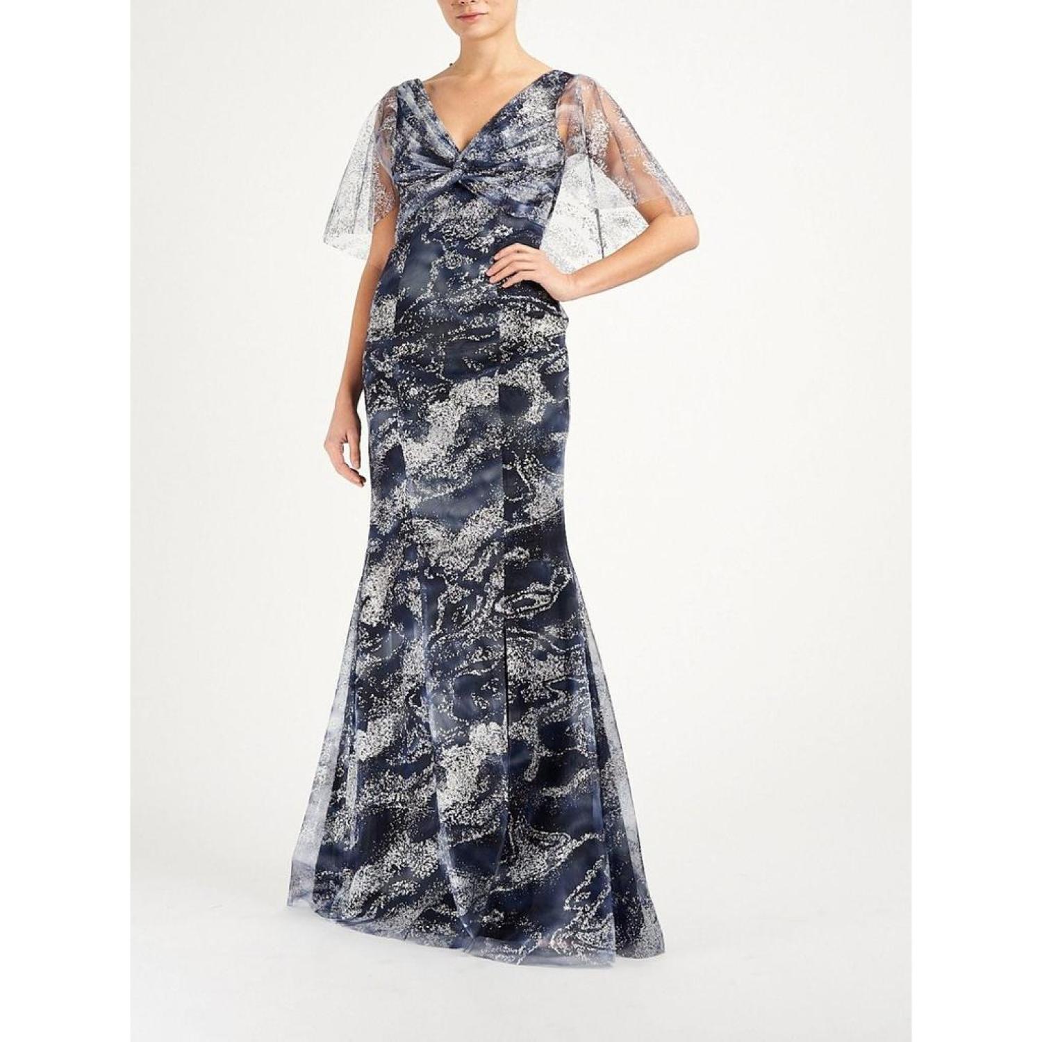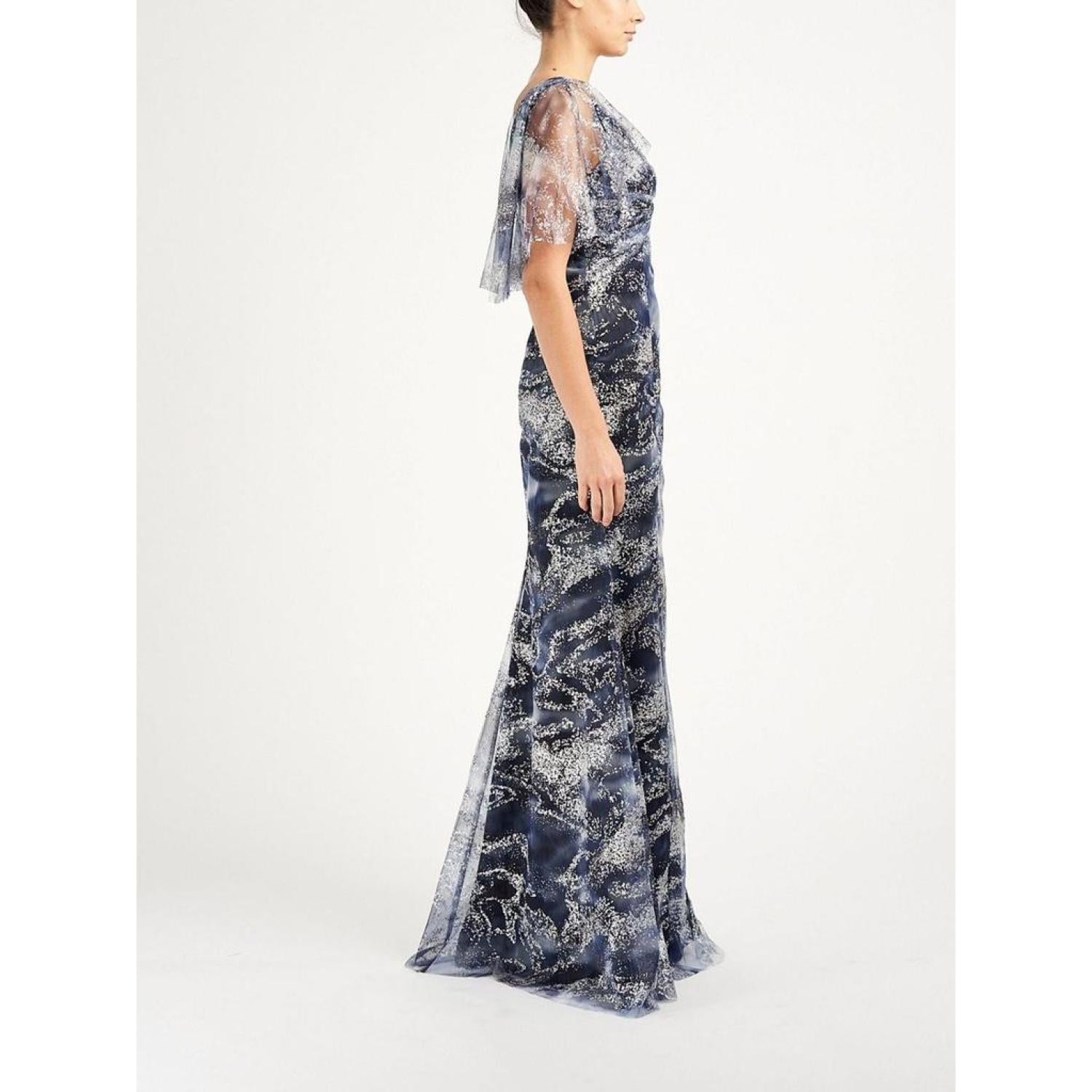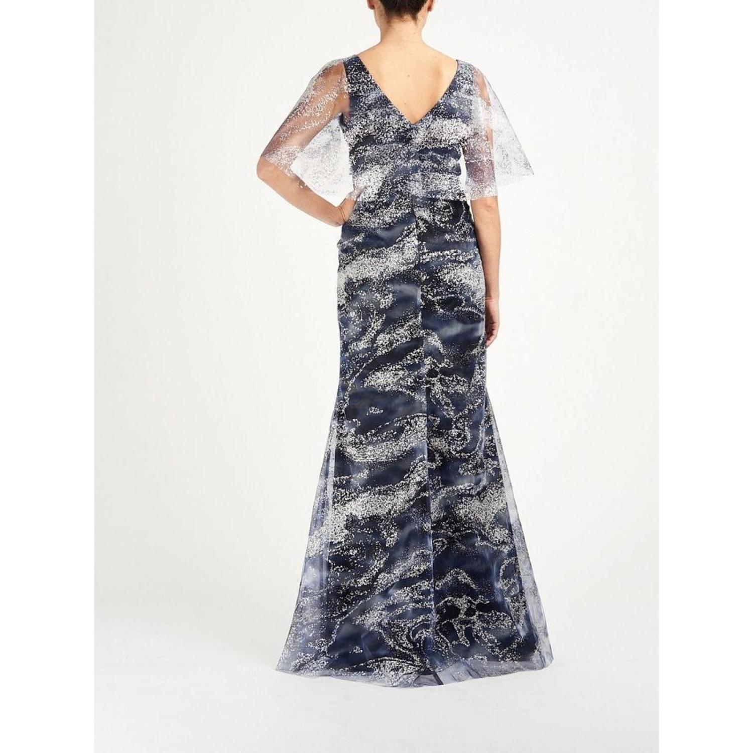 • Cape sleeve V-Neck glitter tulle gown with front side slit