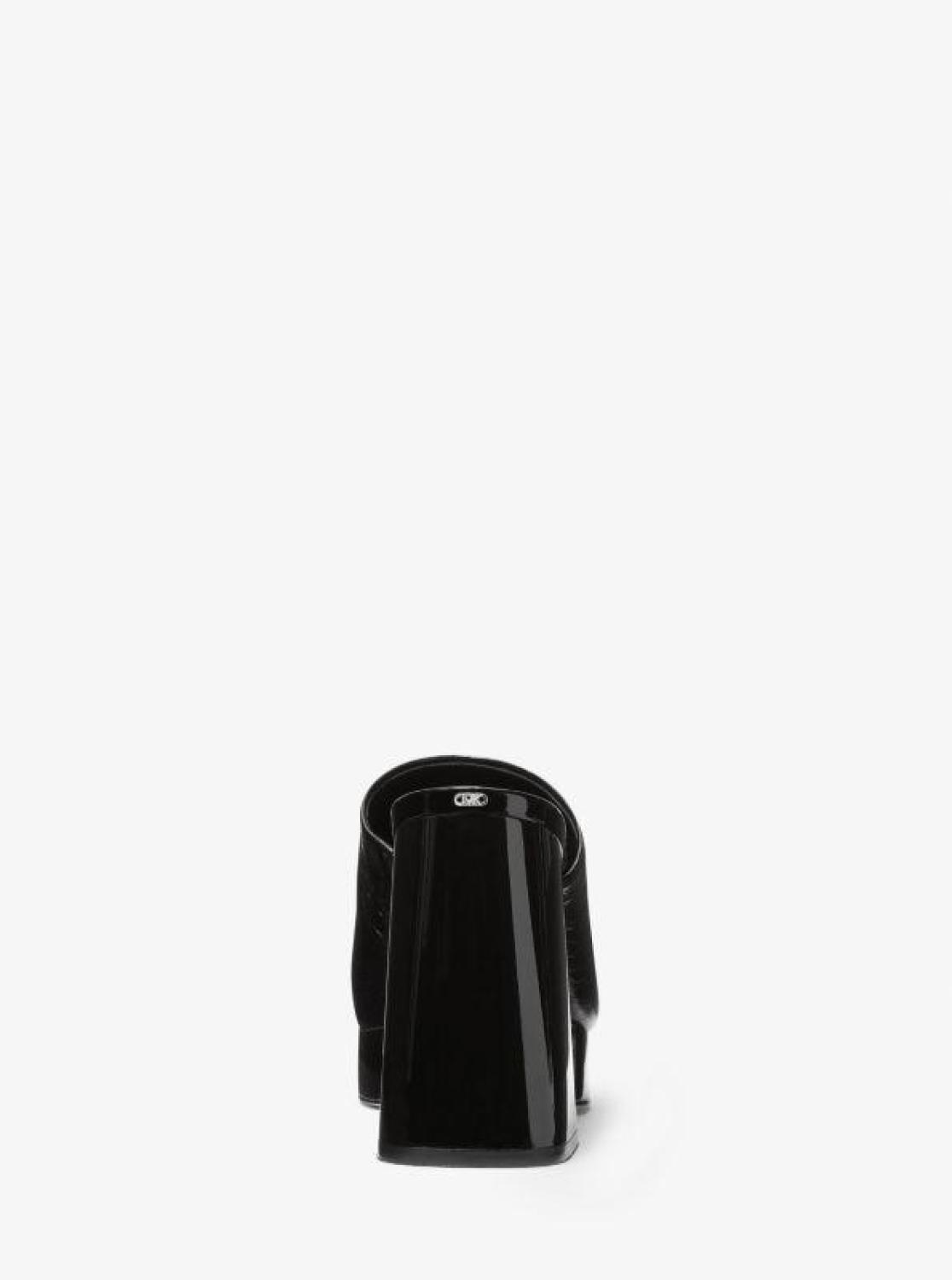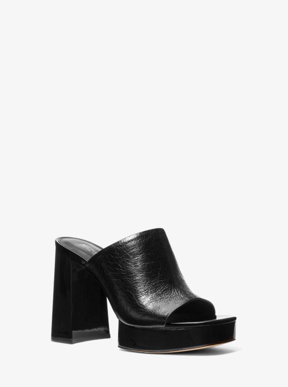 • The Celeste takes the mule to new heights with lacquered platform soles balanced by sturdy block heels. A crackled leather vamp adds textural contrast. The minimal design makes it the perfect backdrop to brightly patterned separates.