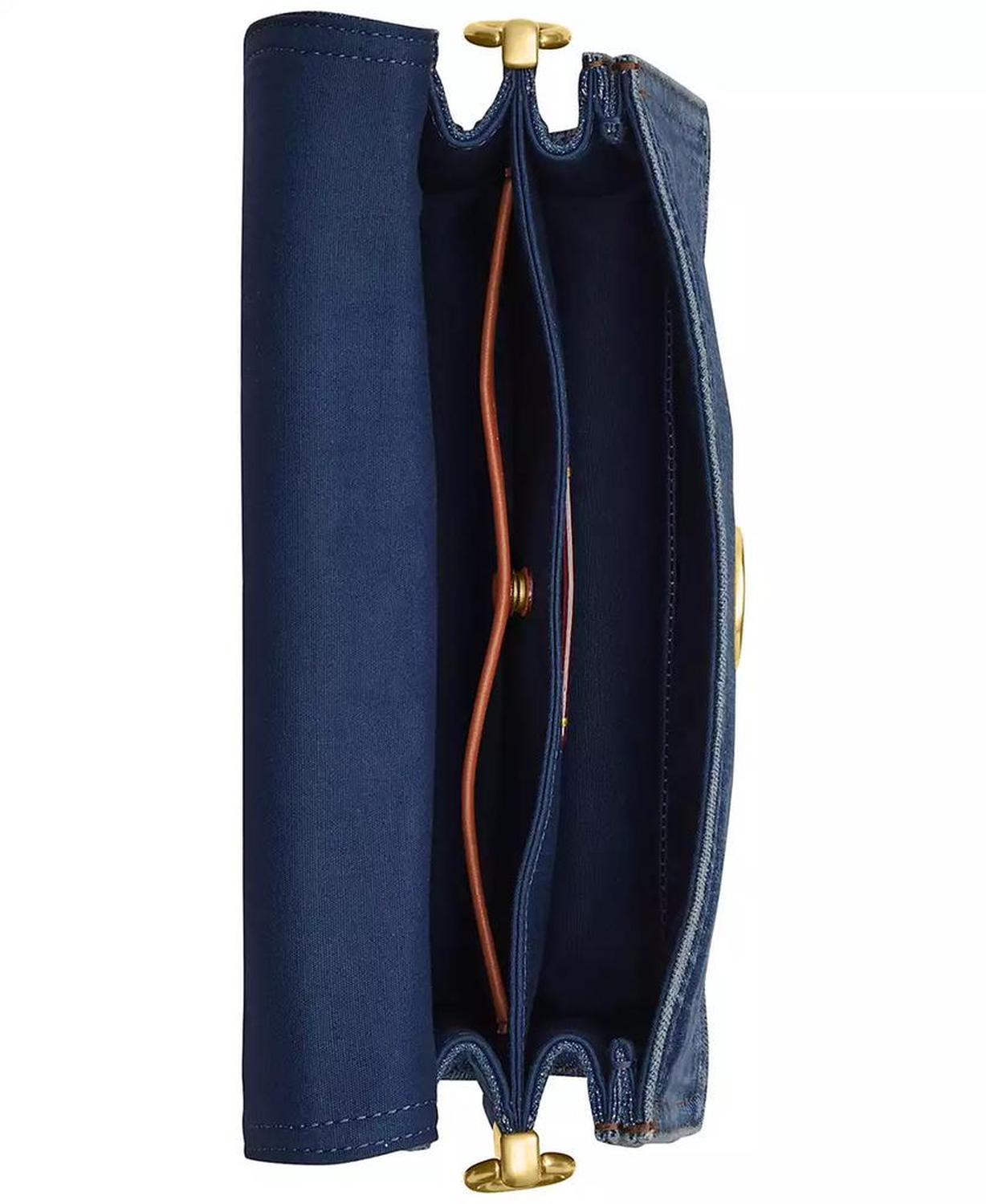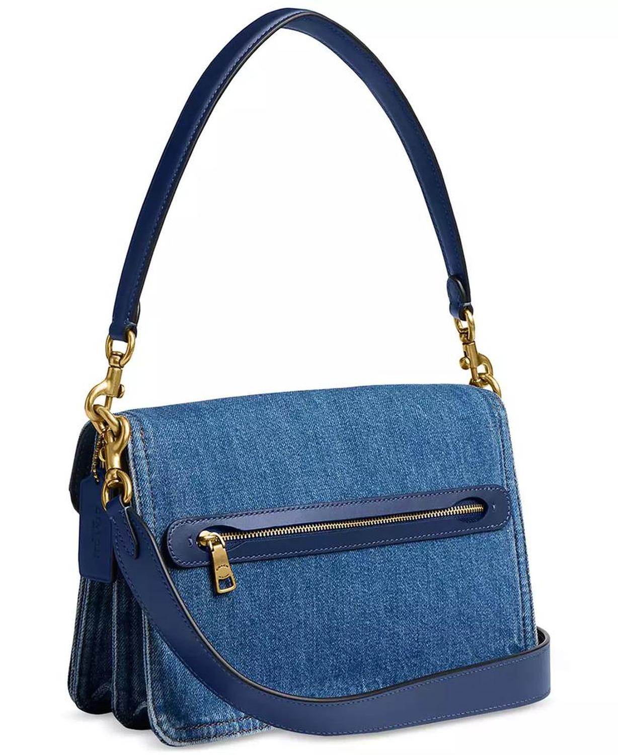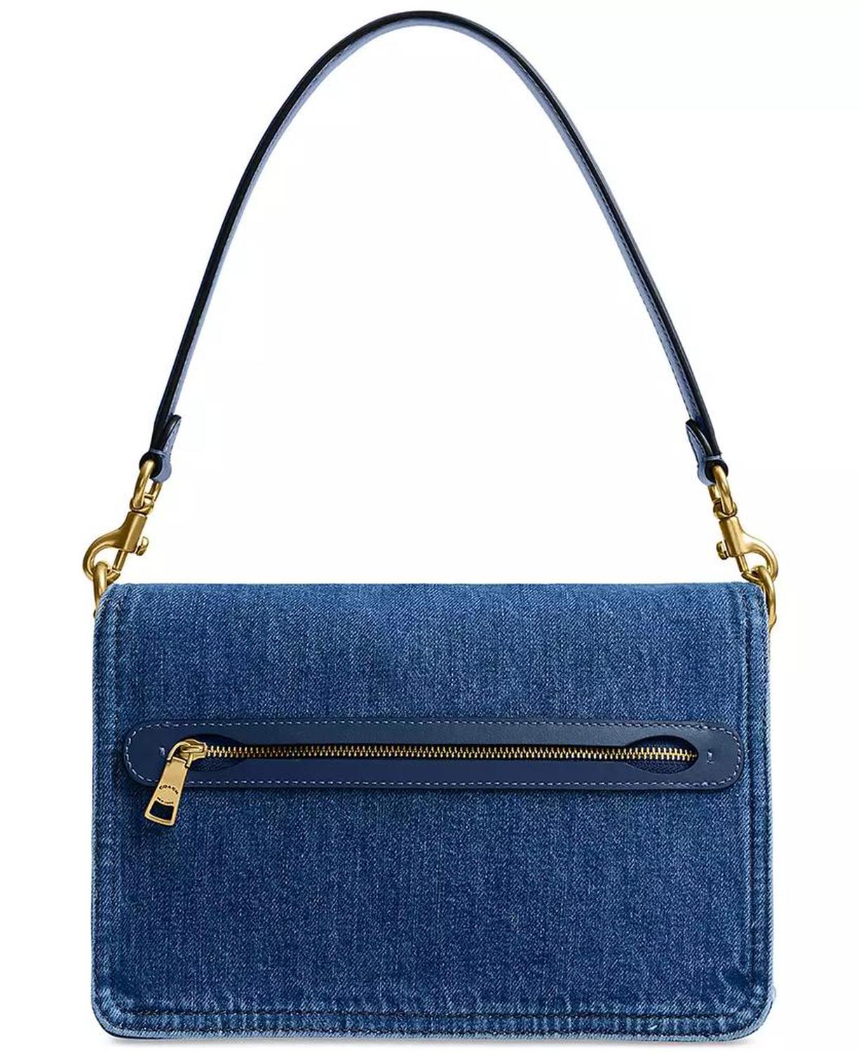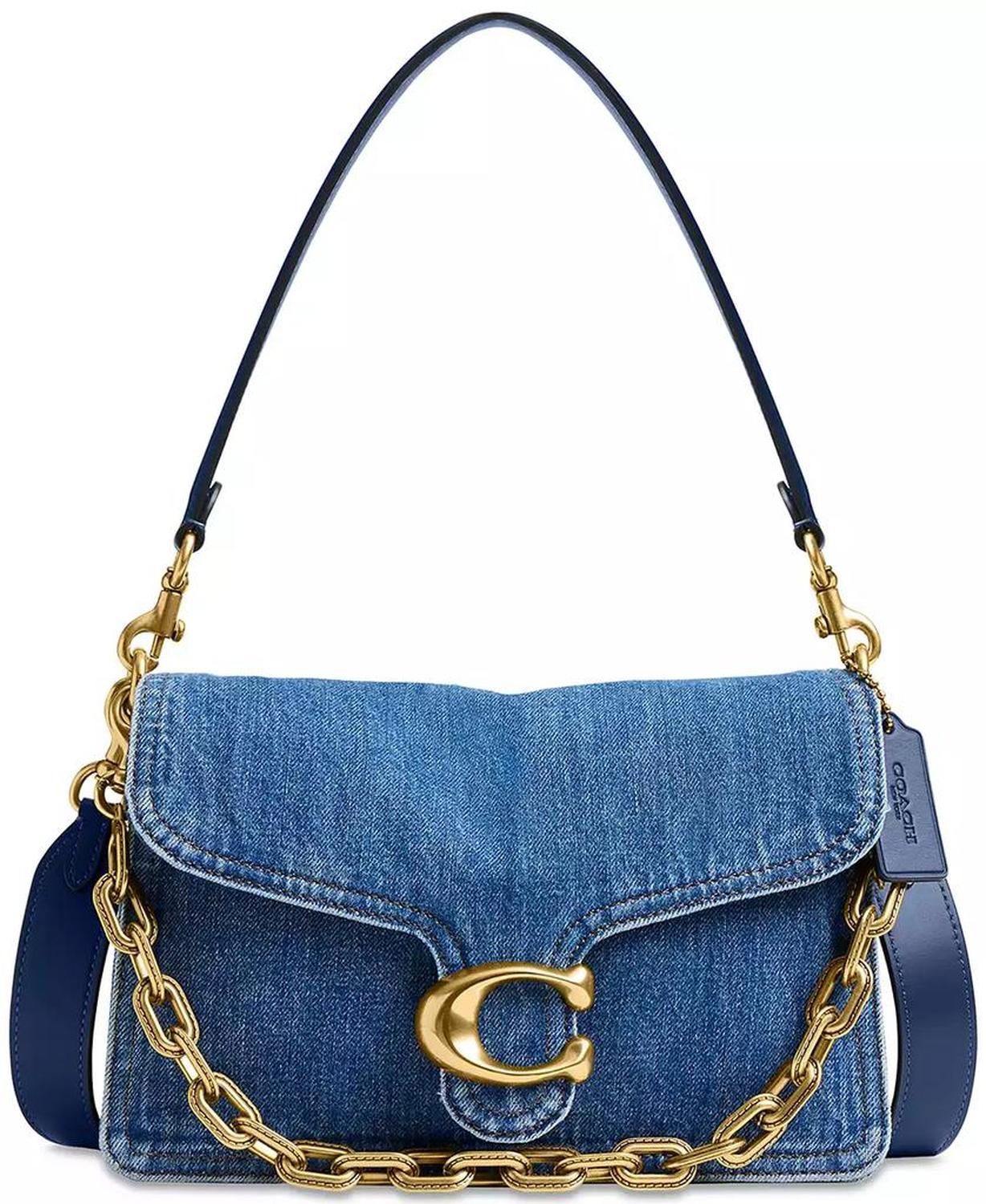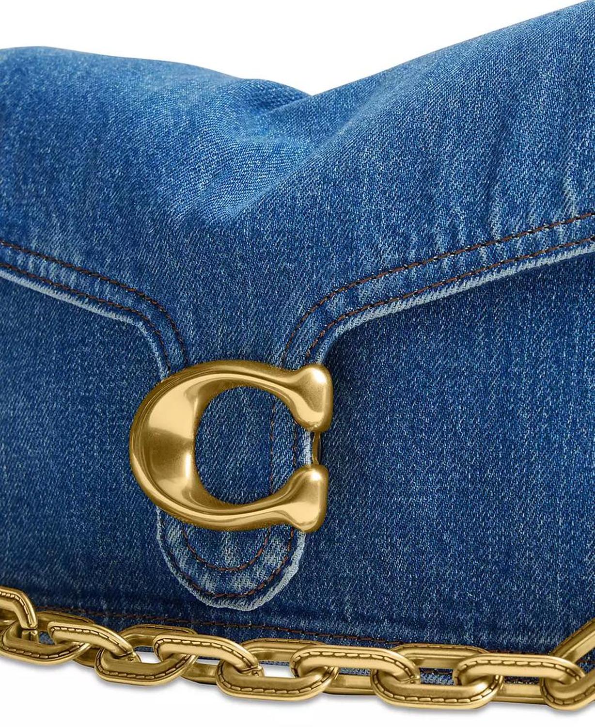 Crafted in classic denim with bright brass hardware and leather trims, this shoulder bag by COACH offers versatile styling options with the multiple removable straps. Small-sized bag; 10-1/4"W x 6-1/2"H x 3-1/4"D (width is measured across the bottom of handbag); 2.01 lbs. approx. weight Silhouette is based off 5'9" model 7-3/4" L removable chain strap; 7-3/4" L removable short strap; 21-1/2" L removable crossbody strap Snap closure Brass-tone exterior hardware & logo, back zip pocket; interior snap pocket 100% cotton; trim: leather Spot clean Imported