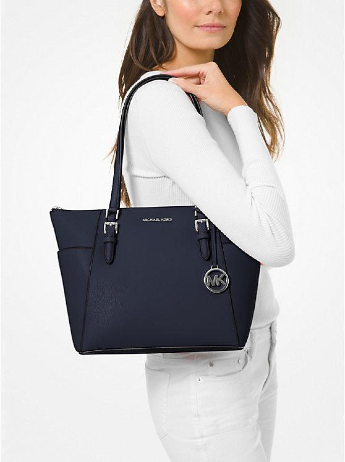 • Our Saffiano leather Charlotte tote bag is a timeless addition to your wardrobe. It features two side slip pockets for quick access to your phone and keys, while its top-zip fastening opens to a spacious interior that’s designed to hold your essentials for a day at the office—plus a change of clothes for the gym. A detachable charm finishes this carryall with covetable appeal.