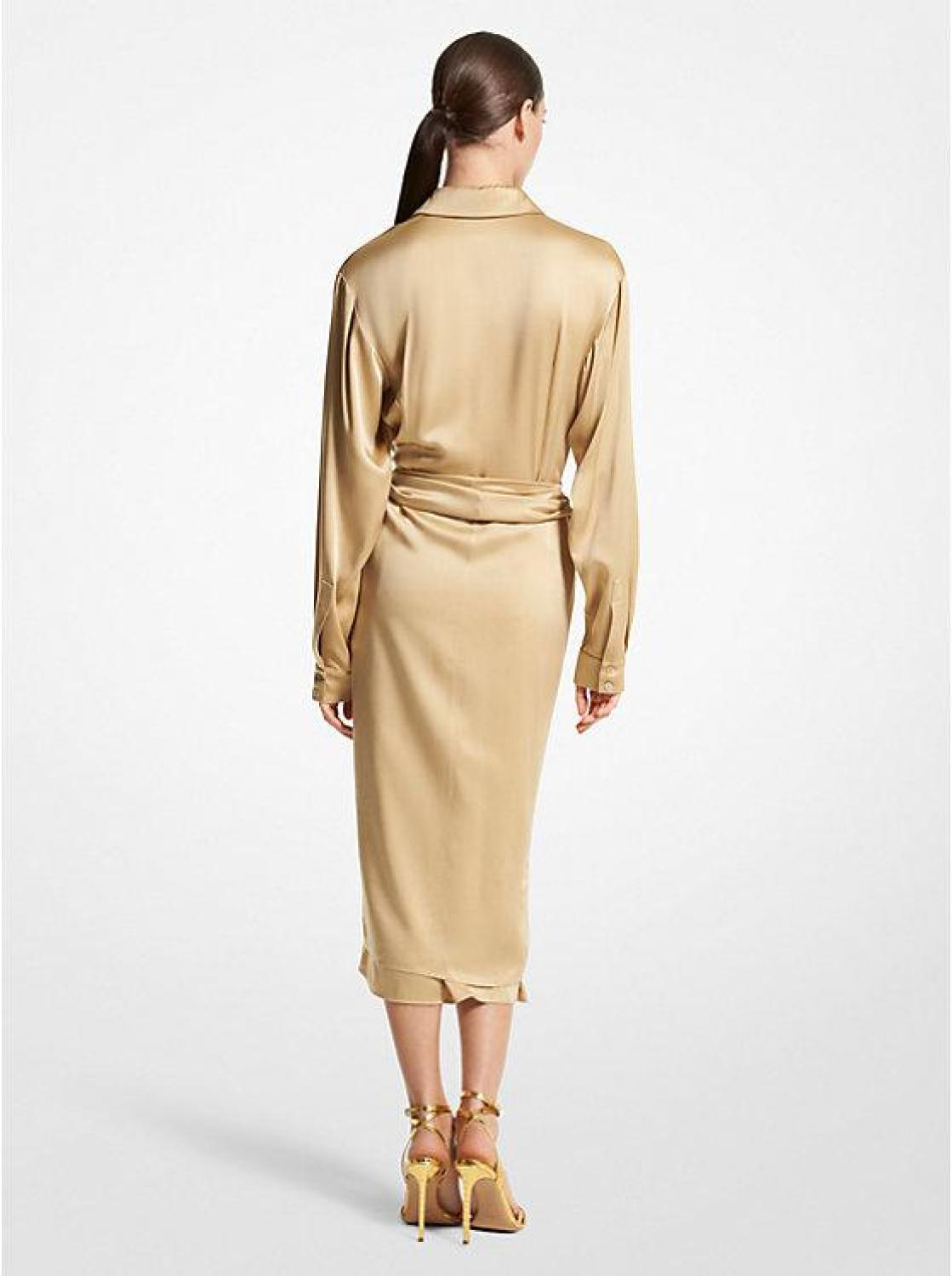 • Evoke the resort-ready opulence of the season with this shirtdress that is finely tailored in Italy from charmeuse for a shimmering effect. A knotted tie-front detail accentuates the waist and nods to the season’s sought-after pareo silhouette. Complement the dune hue with gold accessories.