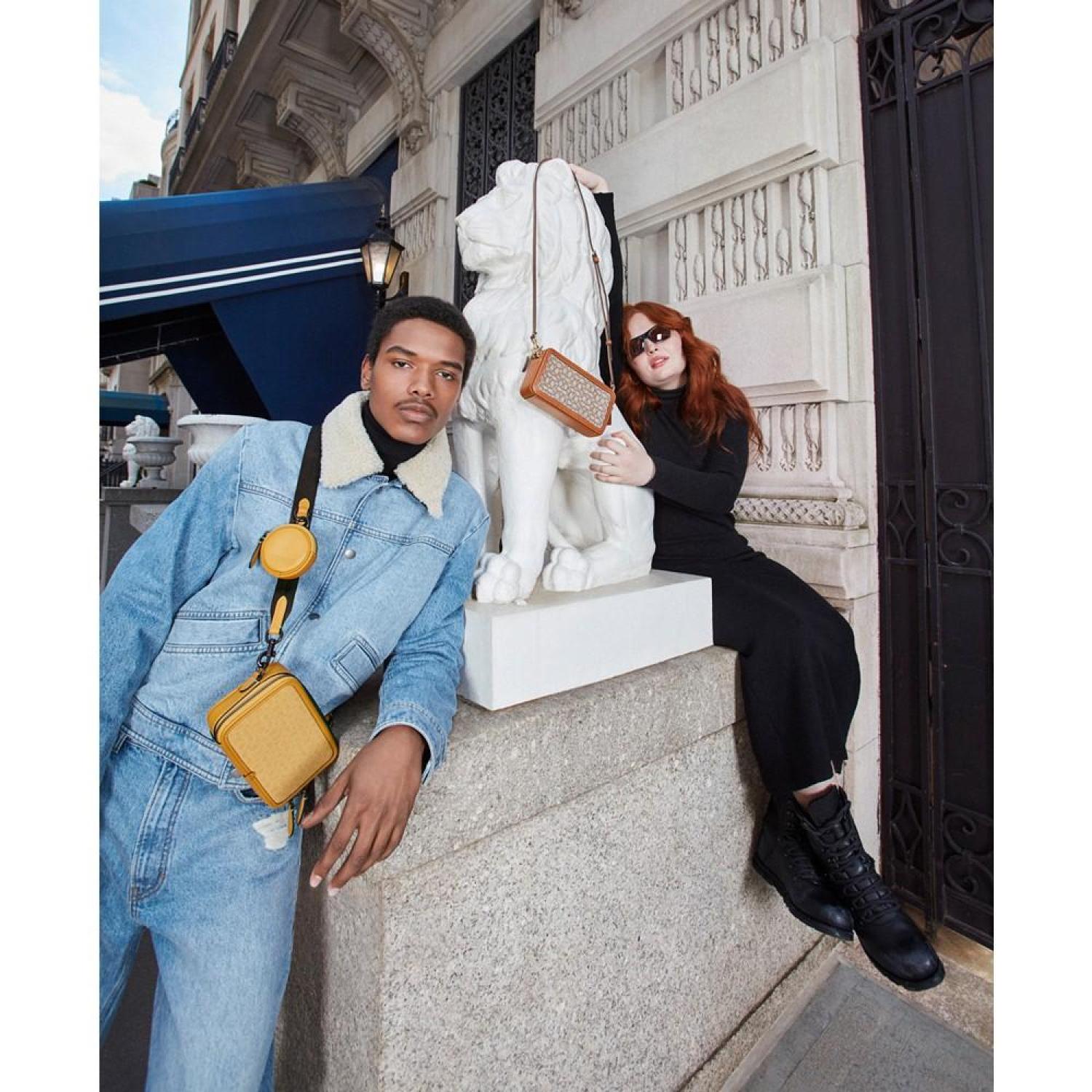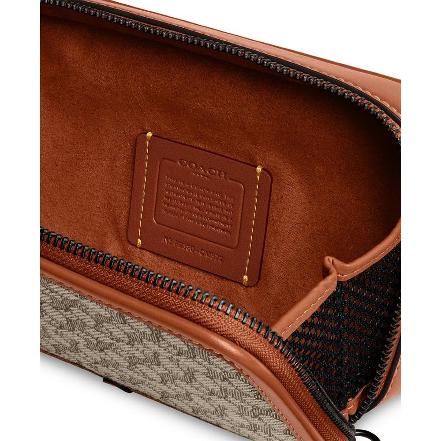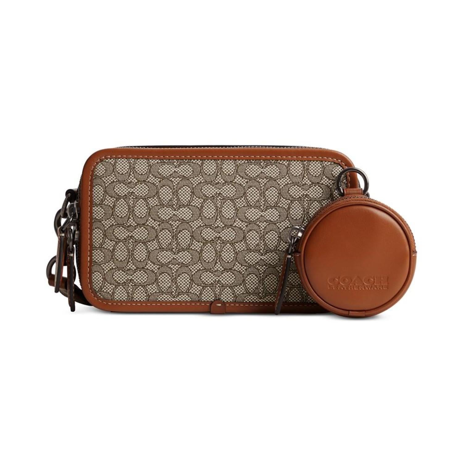 Compact and classic, this crossbody by COACH is an investment in style. The webbed crossbody strap gives this sophisticated bag a casual feel that allows it to be paired with anything. A round, removable pouch adds to the versatility of this bag and can be attached to the strap for a contemporary look or tossed in the bag as an extra organizational feature. Mini sized bag; 7-1/2"W x 4-1/2"H x 1"D (width is measured across the bottom of handbag); removable pouch: 2-3/4"W x 2-3/4"H x 1"D Silhouette is based off 5'9" model 23-1/2"L removable, adjustable strap Zippered closure Nickel-tone hardware & attached hinged D ring 6 interior card slots & leather story patch Cotton, polyester; trim: leather; lining: polyester Spot clean Imported