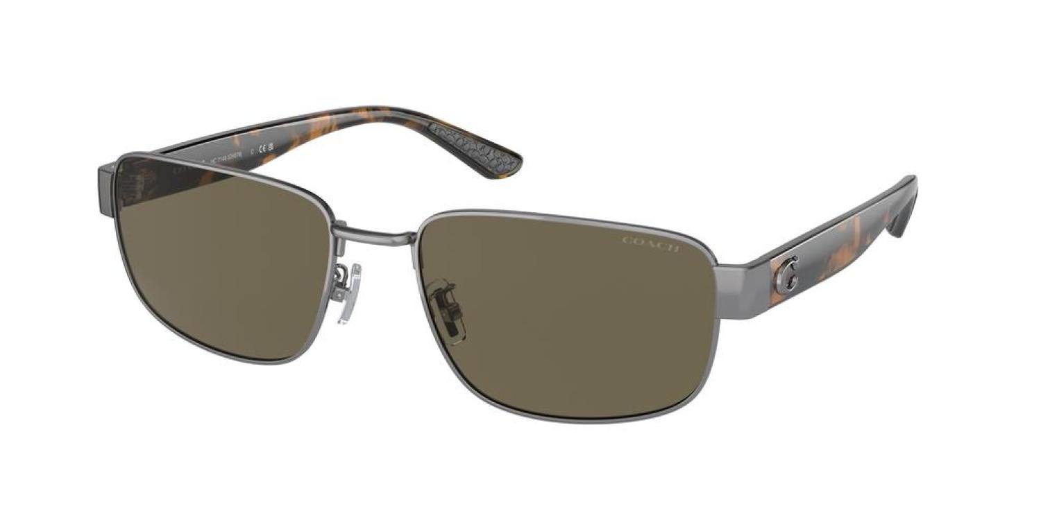 • Coach Men's Sunglasses. Dimensions - 59 mm x 19 mm x 140 mm. Shiny Gunmetal Rectangular Metal frame, Brown Solid lenses. 100% UV Protection, Non-Polarized. Made in China. (HC7149-90043-59)