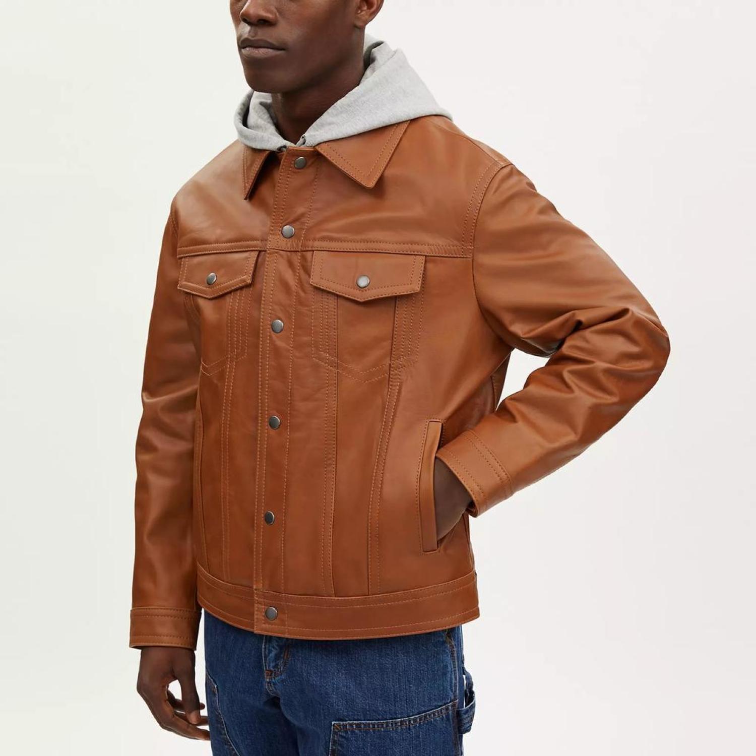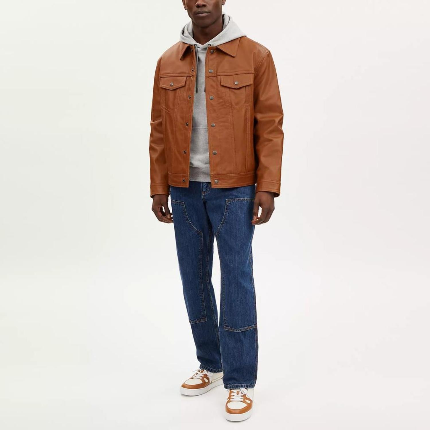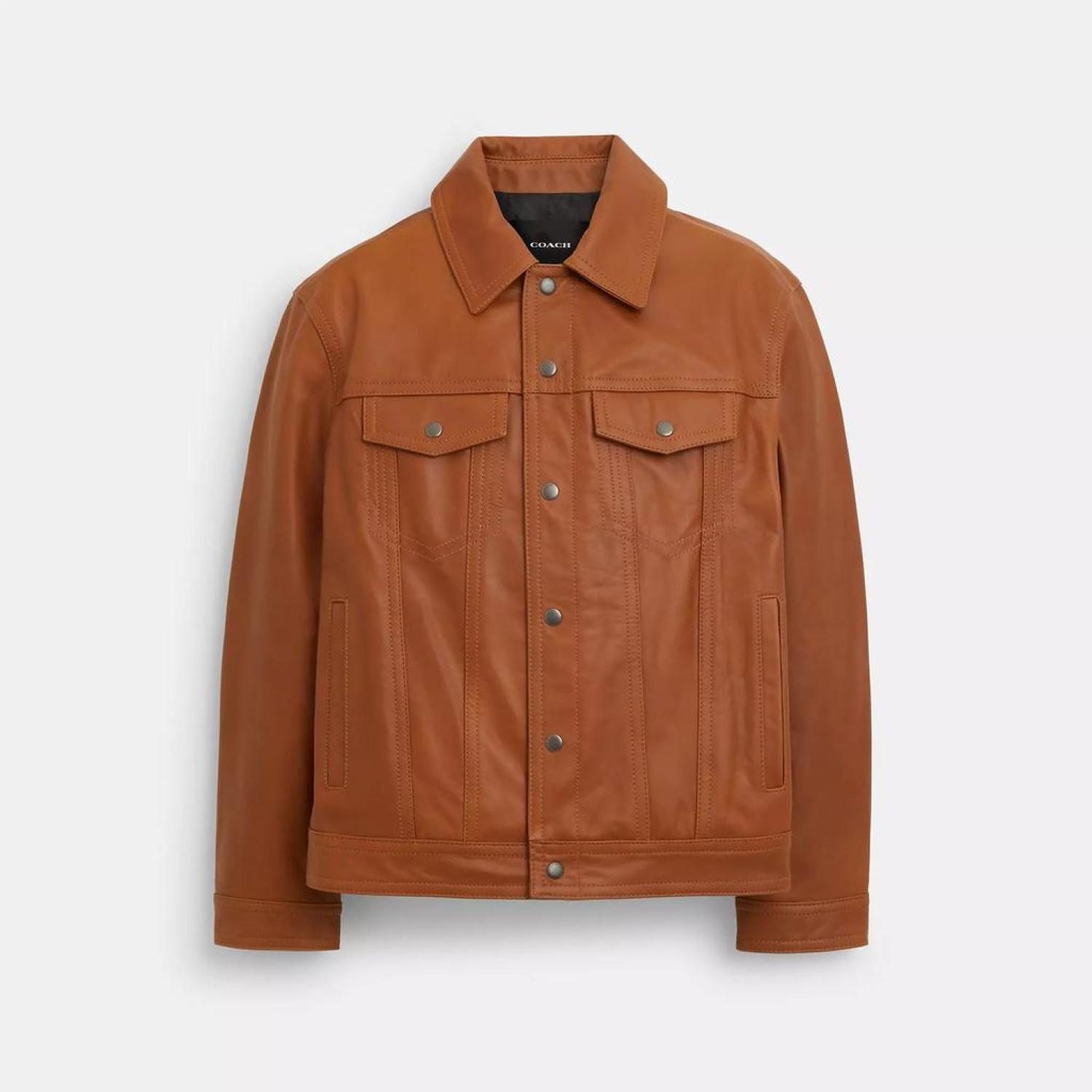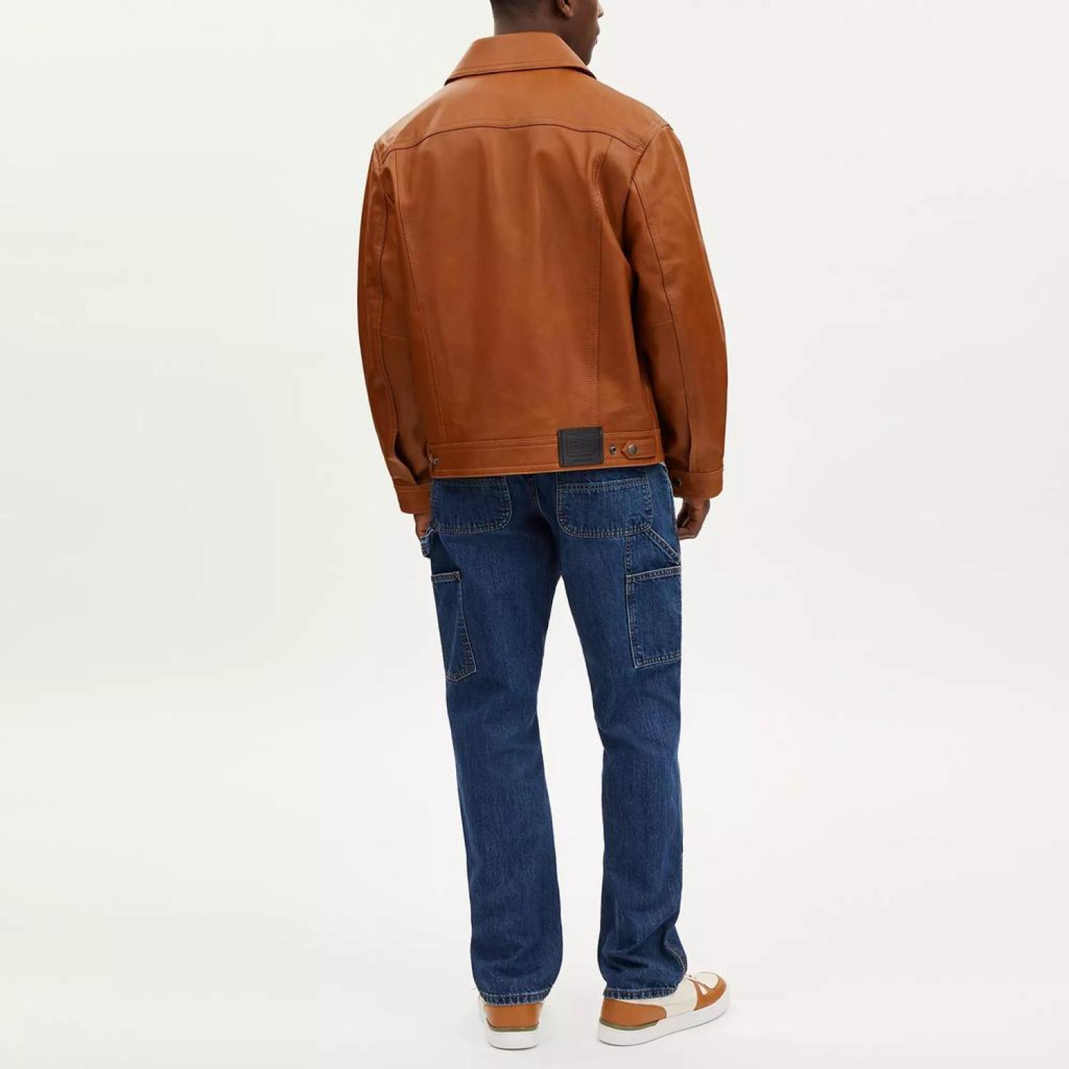 100% cow leather Body lining - 58% polyester 42% viscose Sleeve/pocket lining - 56% polyester 44% viscose Leather details Snap button closure Snap and slip pockets Length - 26 Model is 6'2 (188cm) and wears a size M Style No. CM795 | Coach Outlet Leather Trucker Jacket - Red, Size - Medium