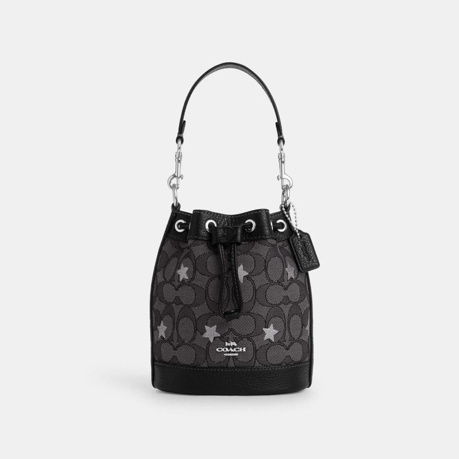 - Signature jacquard and refined pebble leather One credit card slot Drawstring closure fabric lining Detachable handle with 5 1/2 drop Detachable strap with 23 drop for shoulder or crossbody wear 5 1/2 (L) x 6 1/2 (H) x 3 1/2 (W) Style No. CP015 | Coach Outlet Mini Dempsey Bucket Bag In Signature Jacquard With Star Embroidery - Black