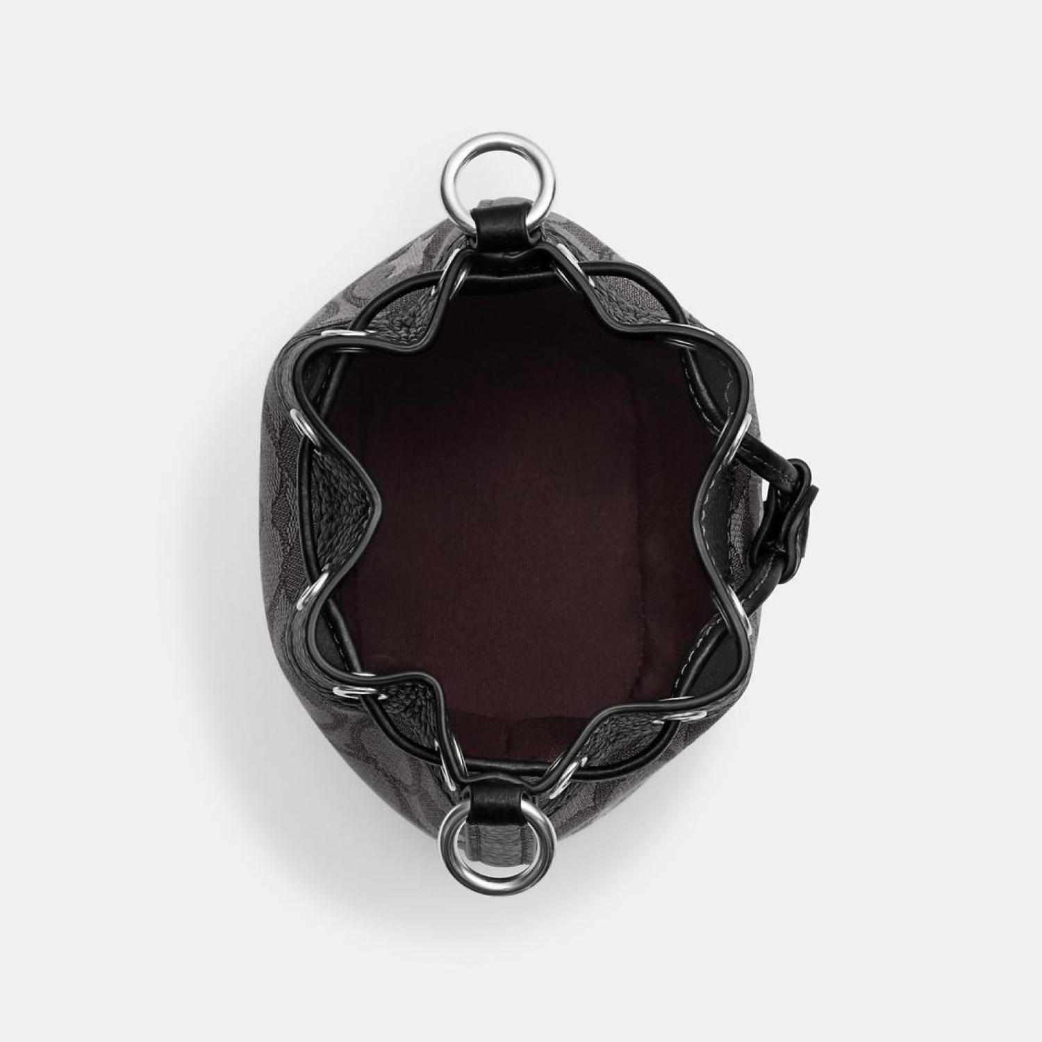 Signature jacquard and refined pebble leather One credit card slot Drawstring closure fabric lining Detachable handle with 5 1/2 drop Detachable strap with 23 drop for shoulder or crossbody wear 5 1/2 (L) x 6 1/2 (H) x 3 1/2 (W) Style No. CP015 | Coach Outlet Mini Dempsey Bucket Bag In Signature Jacquard With Star Embroidery - Black
