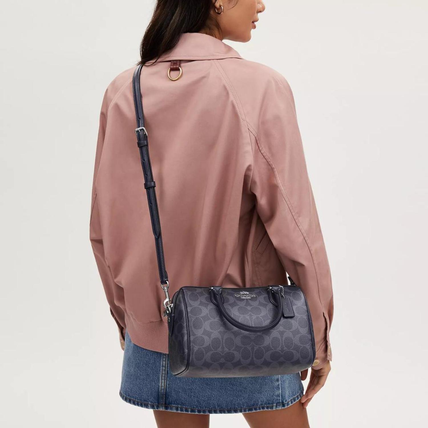 Signature coated canvas and recycled leather Inside zip and multifunction pockets Zip closure fabric lining Handles with 4 1/4 drop Outside zip pocket Detachable strap with 23 drop for shoulder or crossbody wear 10 (L) x 6 1/2 (H) x 5 1/2 (W) Style No. CS188 | Coach Outlet Rowan Satchel Bag In Signature Canvas - Blue