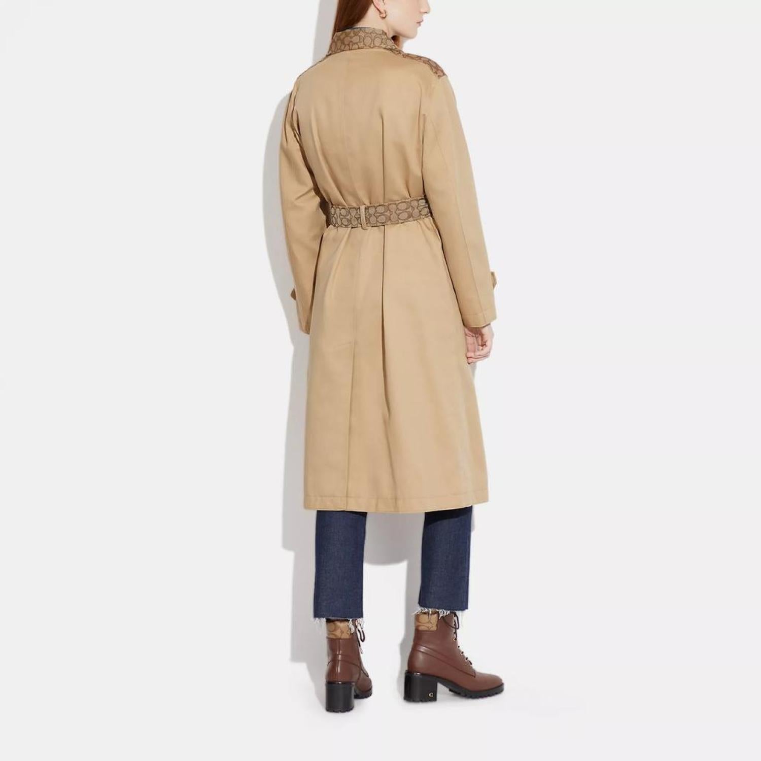 • 63% organic cotton 37% lyocell Combo shell - 55% cotton 45% polyester Lining - 58% polyester 42% viscose Turnlock closure Slip pockets Self-tie belt Length - 43 1/2 Model is 5'10 (178cm) chest 31 (79cm) waist 24 (61cm) hips 35 (89cm) and wears a size S Style No. CR128 | Coach Outlet Signature Turnlock Trench - Classic Khaki, Size - X-Small