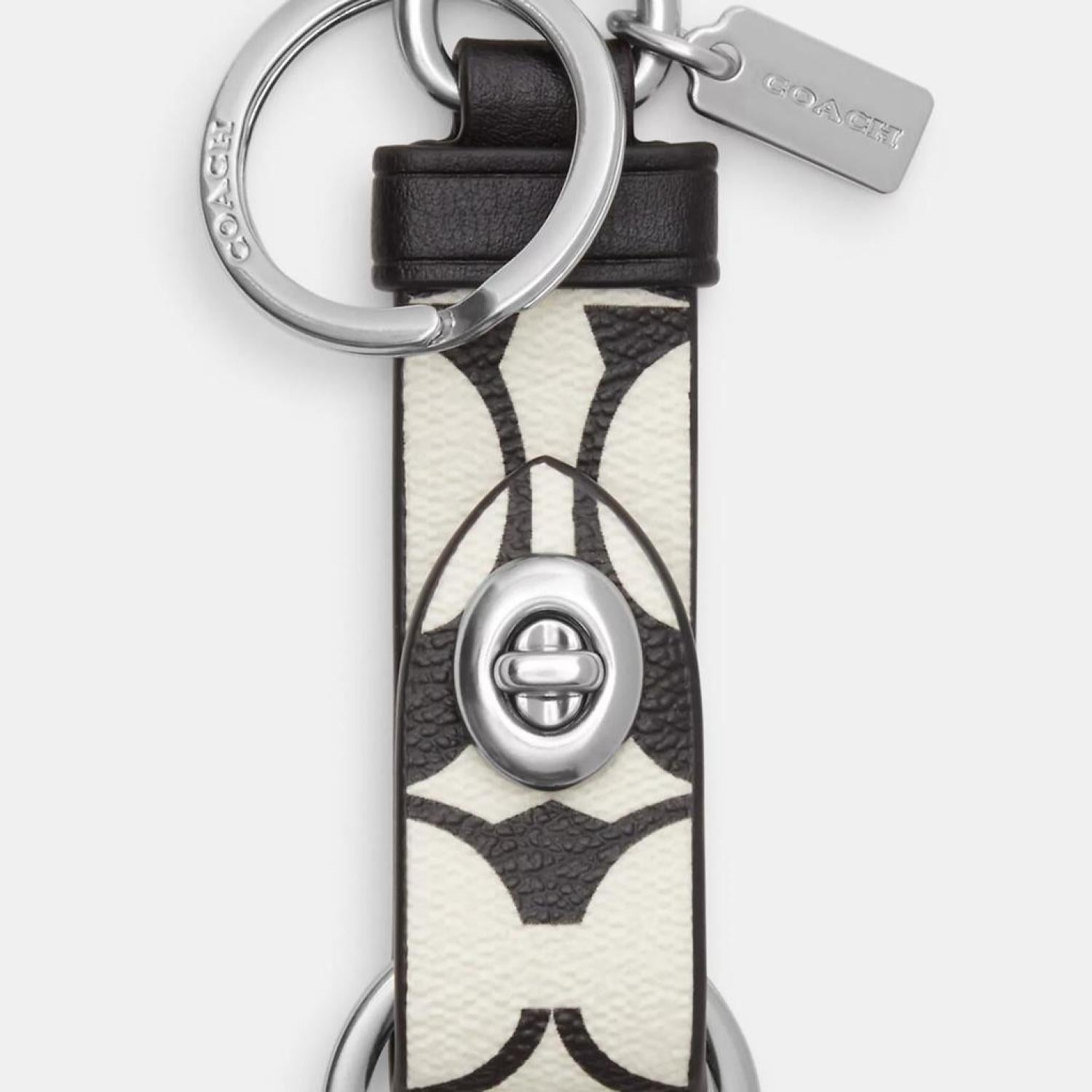 • Signature coated canvas and smooth leather Snap closure Attached split key rings and dogleash clip 3/4 (L) x 2 1/2 (H) Style No. CP362 | Coach Outlet Trigger Snap Bag Charm In Signature Canvas - White