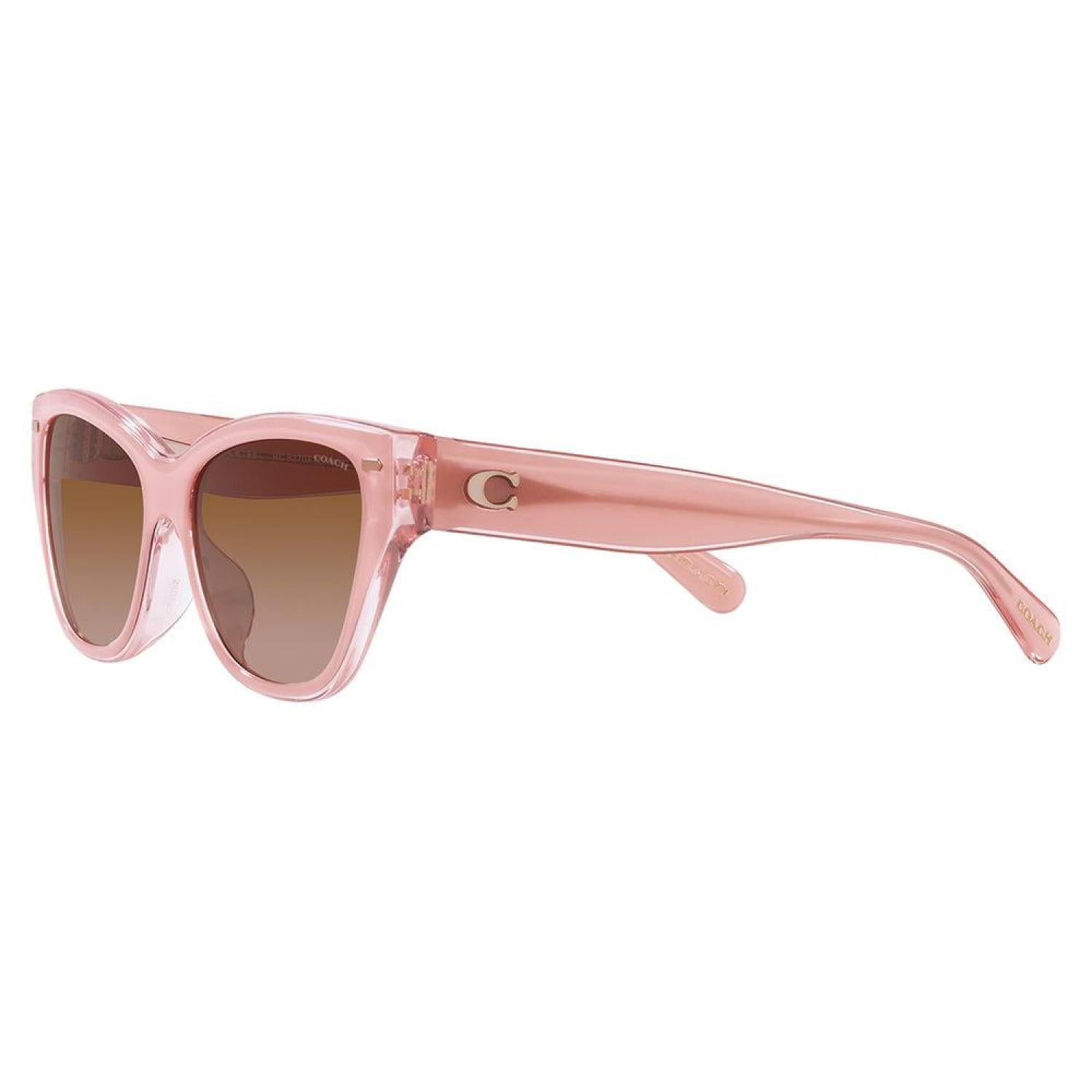 Coach Women's Sunglasses. Dimensions - 56 mm x 16 mm x 145 mm. Milky Pink and Transparent Pink Cat-Eye Acetate frame, Brown Gradient lenses. 100% UV Protection, Non-Polarized. Made in China. (HC8370F-574313-56)