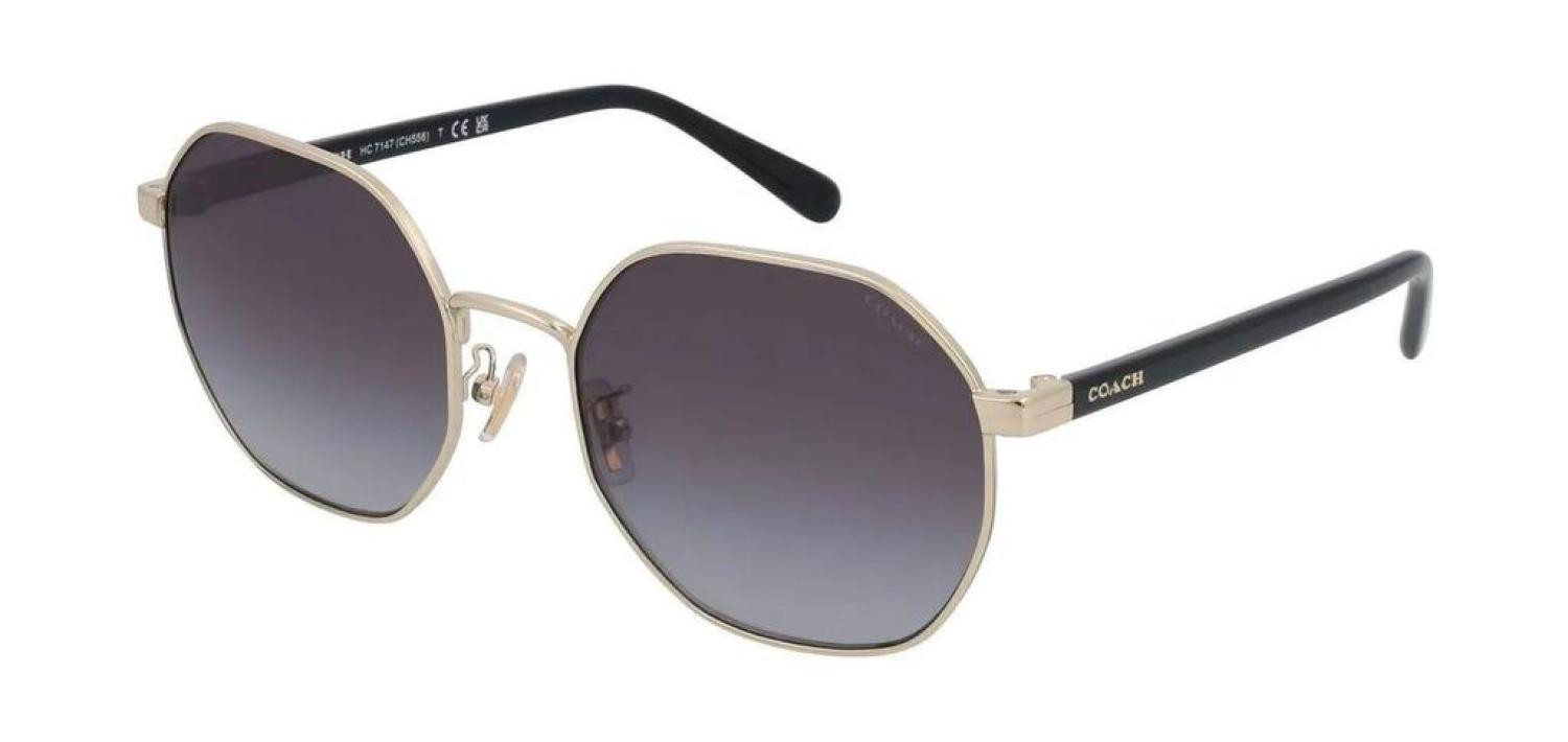 Coach Women's Sunglasses. Dimensions - 56 mm x 20 mm x 140 mm. Shiny Light Gold Irregular Metal frame, Grey Gradient lenses. 100% UV Protection, Non-Polarized. Made in China. (HC7147-90058G-56)