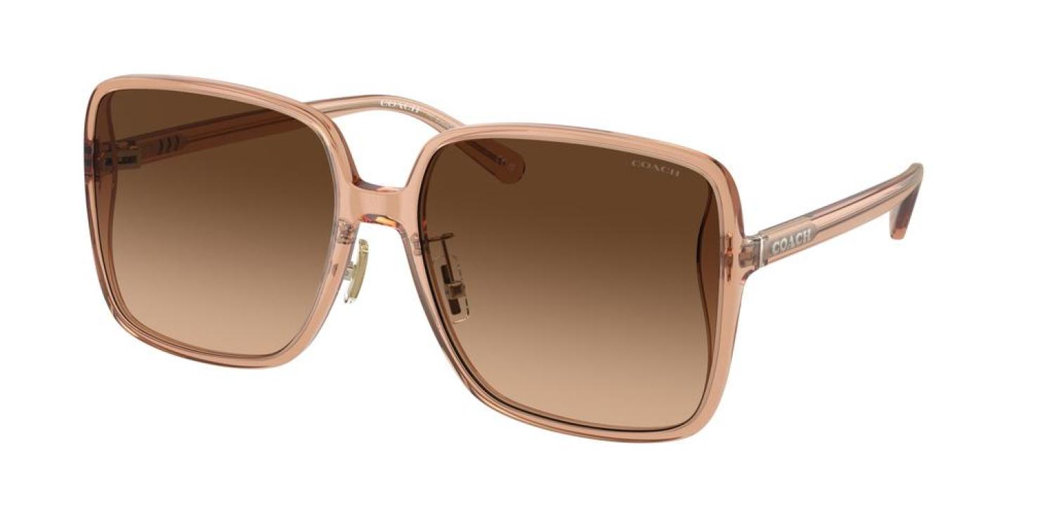 Coach Women's Sunglasses. Dimensions - 61 mm x 17 mm x 145 mm. Transparent Brown Square Plastic frame, Brown Gradient lenses. 100% UV Protection, Non-Polarized. Made in China. (HC8368D-556174-61)