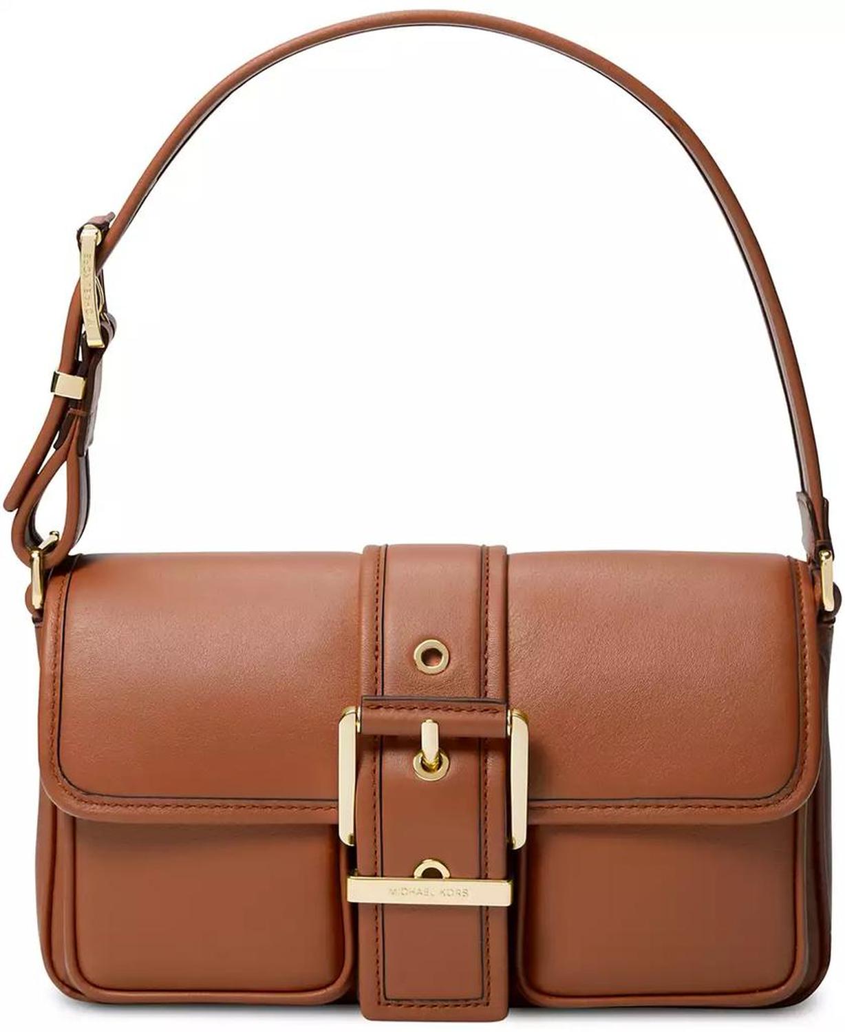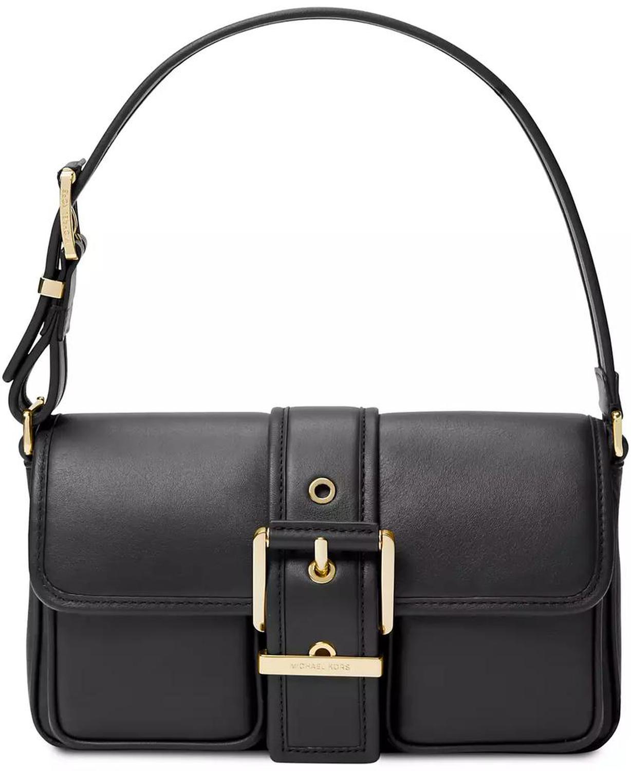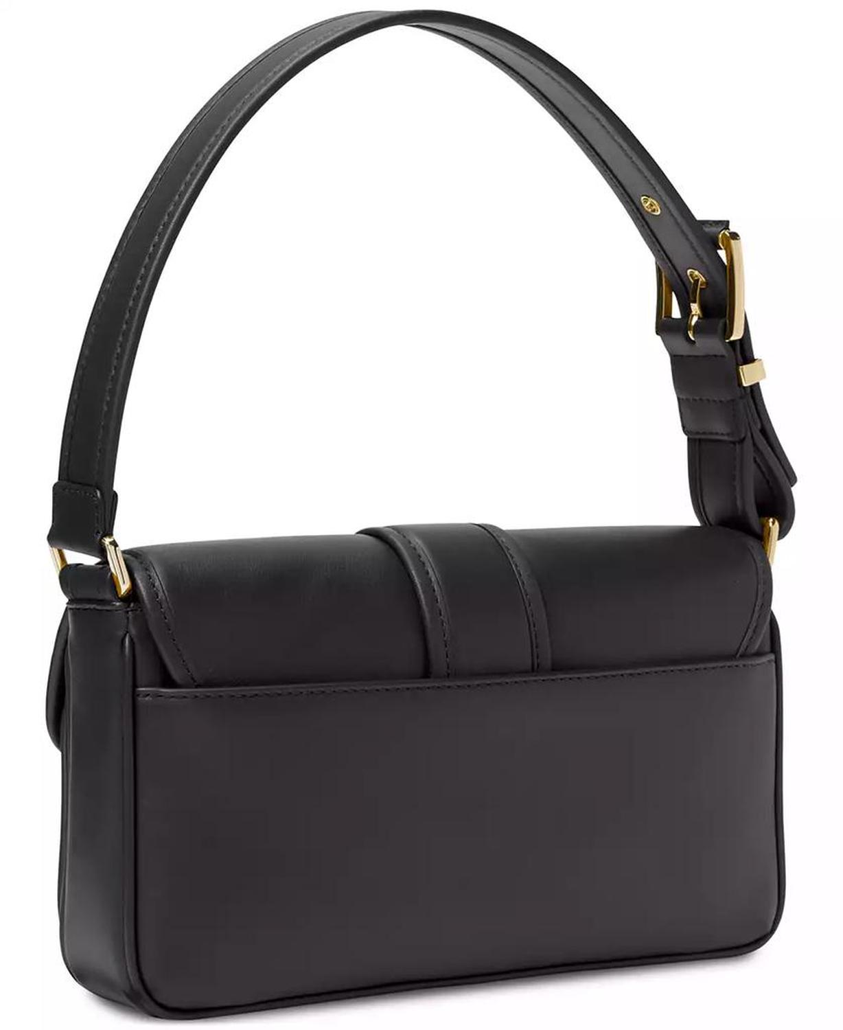 Super chic with a decorative buckle at the front, this leather shoulder bag is a practical and stylish everyday accessory. Small-sized bag; 10-1/2"W x 6-3/4"H x 2-3/4"D (width is measured across the bottom of handbag); 0.68 lbs. approx. weight Silhouette is based off 5'9" model 8"L handle Magnetic flap closure Gold-tone hardware & decorative buckle with logo, exterior back slip pocket, 2 front slip pockets under flap, interior slip pocket Leather; lining: 100% polyester; trim: 60% PU, 20% cotton, 20% polyester Spot clean Imported