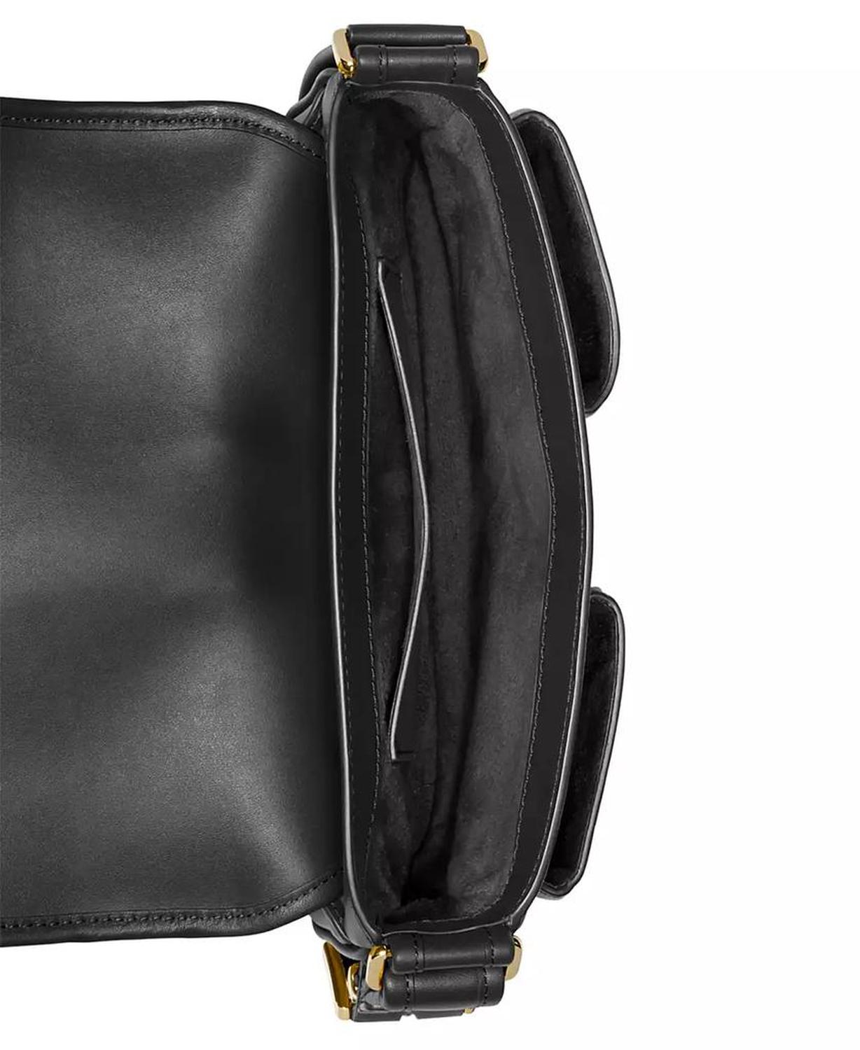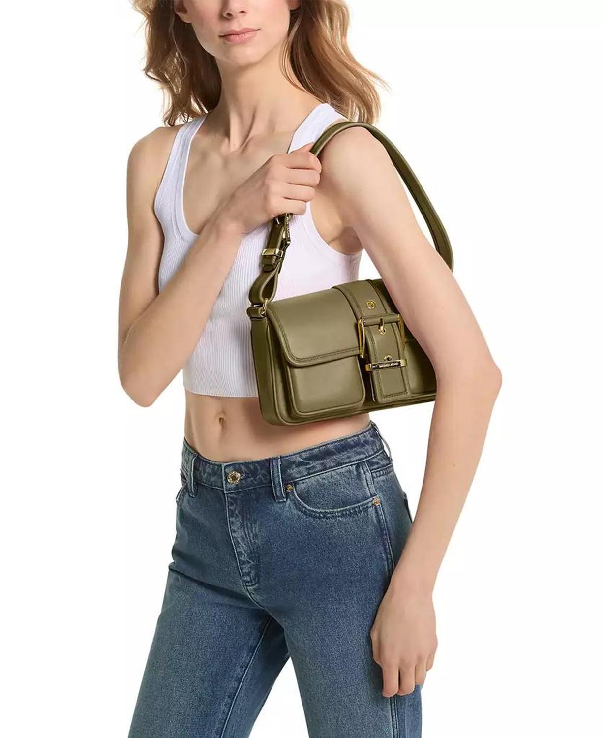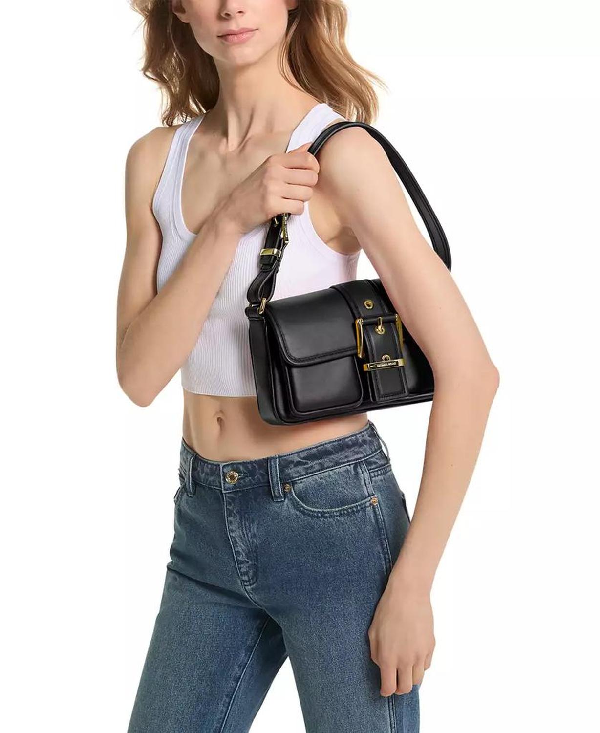 Super chic with a decorative buckle at the front, this leather shoulder bag is a practical and stylish everyday accessory. Small-sized bag; 10-1/2"W x 6-3/4"H x 2-3/4"D (width is measured across the bottom of handbag); 0.68 lbs. approx. weight Silhouette is based off 5'9" model 8"L handle Magnetic flap closure Gold-tone hardware & decorative buckle with logo, exterior back slip pocket, 2 front slip pockets under flap, interior slip pocket Leather; lining: 100% polyester; trim: 60% PU, 20% cotton, 20% polyester Spot clean Imported