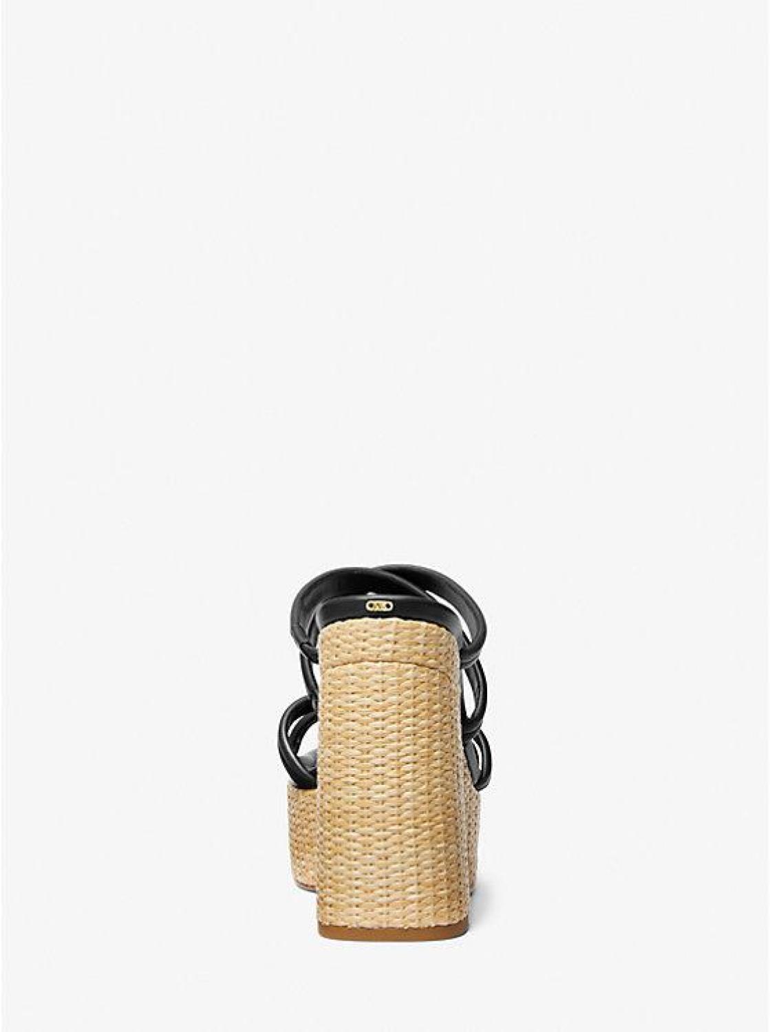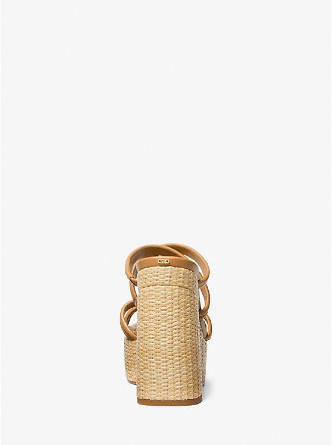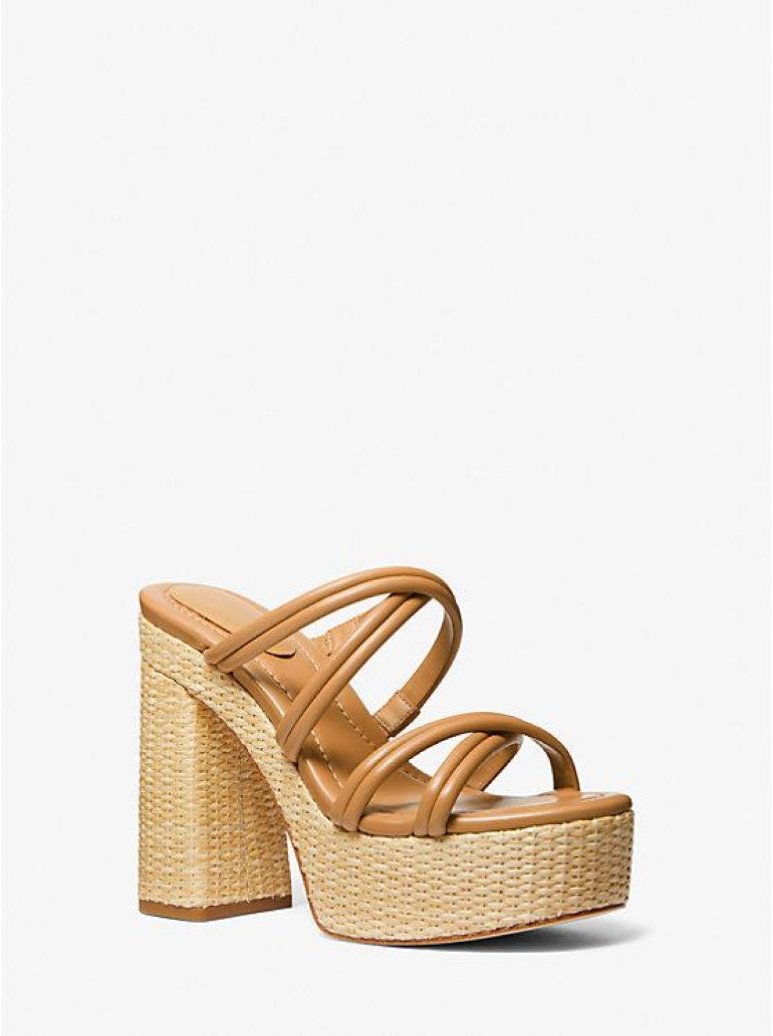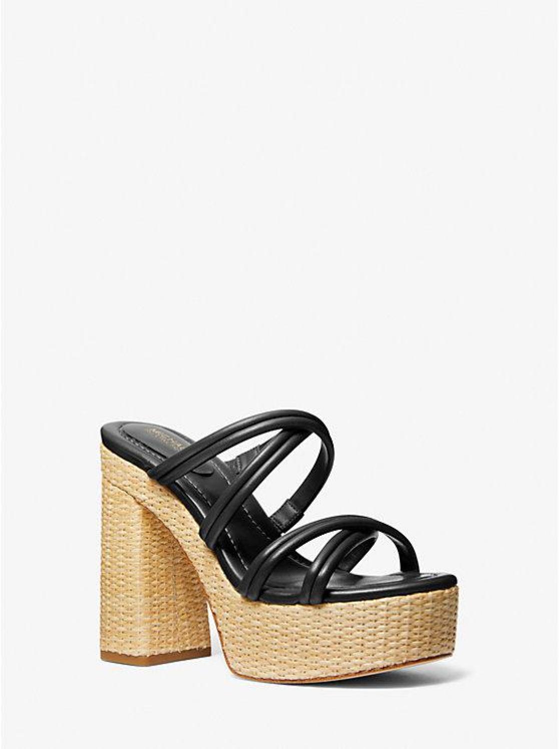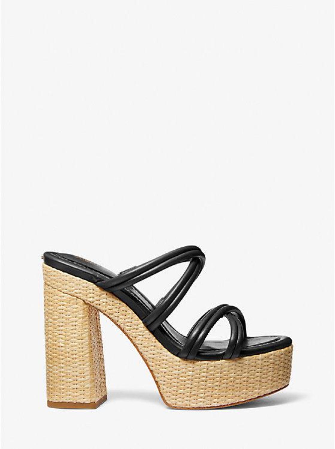 • A statement-making sandal is the cornerstone of any warm-weather closet, and our leather Corrine is no exception to the rule. This strappy pair is defined by a soaring straw block heel that’s balanced by a sturdy platform.