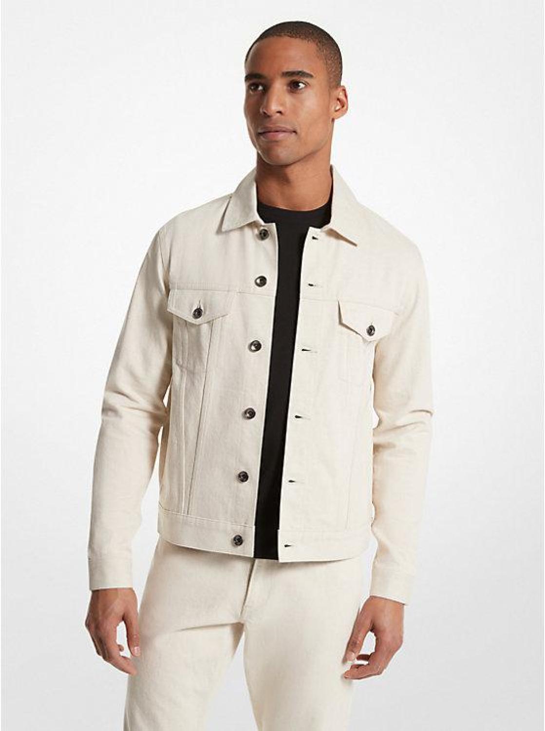 A modern jacket with vintage appeal. This trucker-style denim topper is made from a cotton-linen blend for a lightweight take on an all-season favorite. This style features classic styling, including front flap pockets. Match it back to ecru denim for a next-level pairing. • Jacket • Denim • 63% cotton/20% linen/17% viscose • Button fastening • Machine wash • Imported • Model is 6’3”/190 cm wearing size M • Jacket • Denim • 63% cotton/20% linen/17% viscose • Button fastening • Machine wash • Imported • Model is 6’3”/190 cm wearing size M