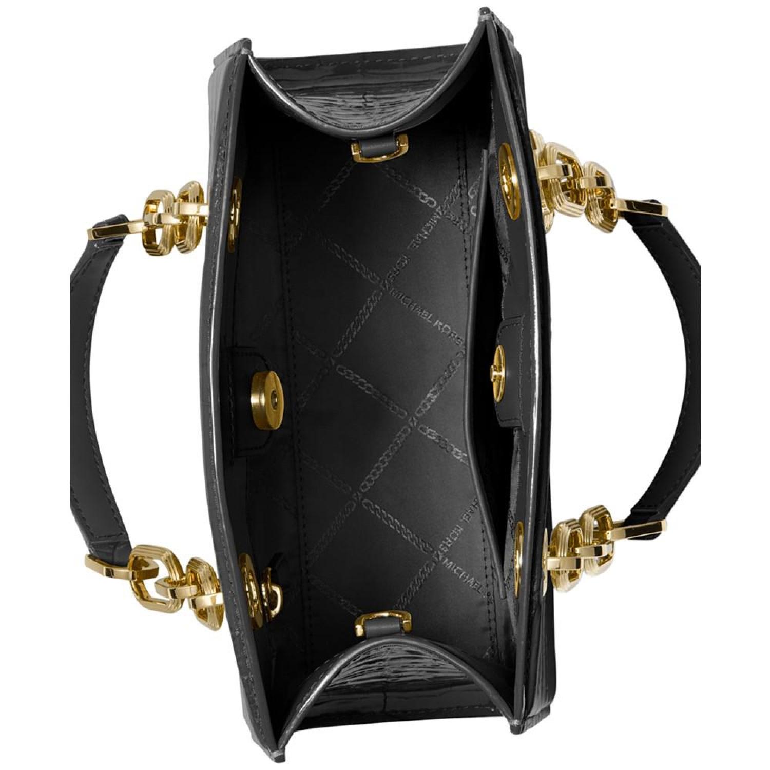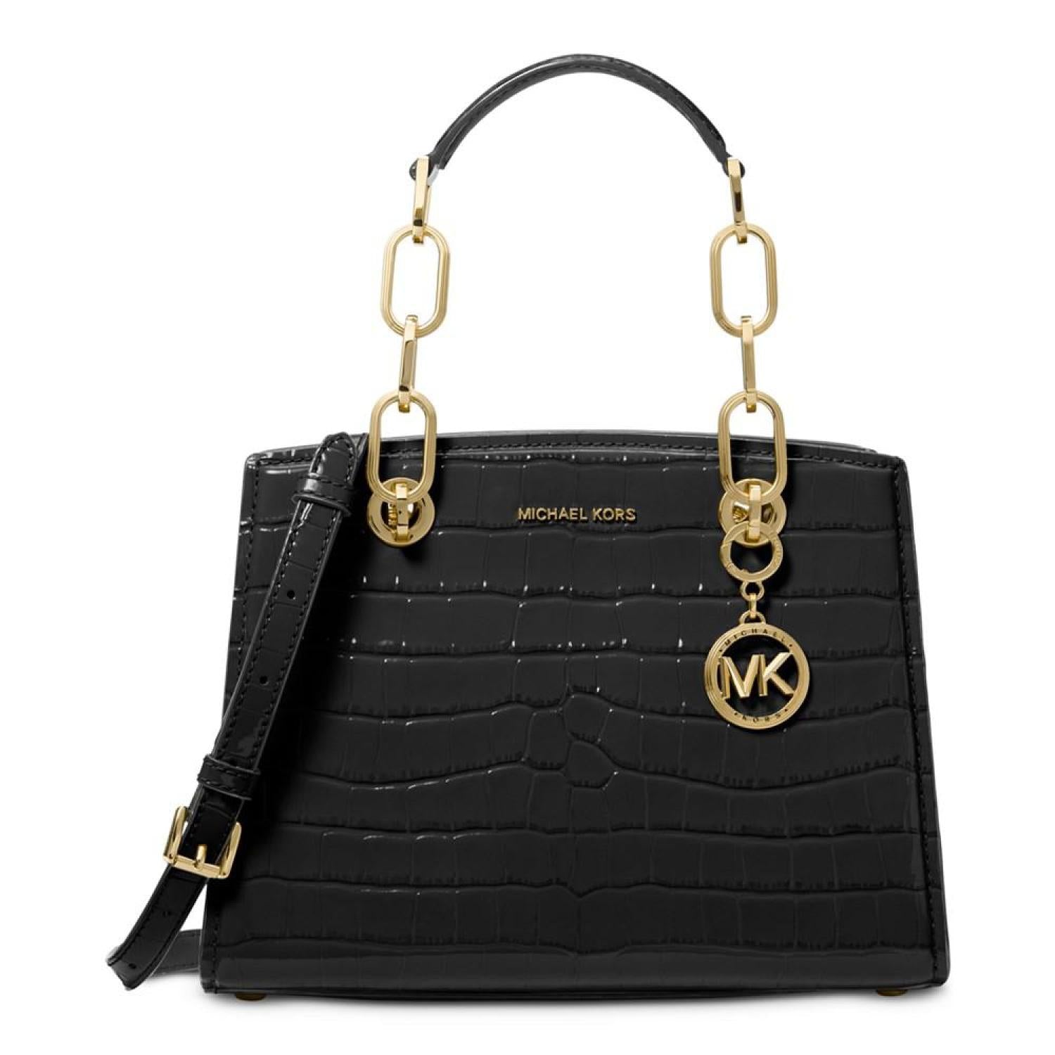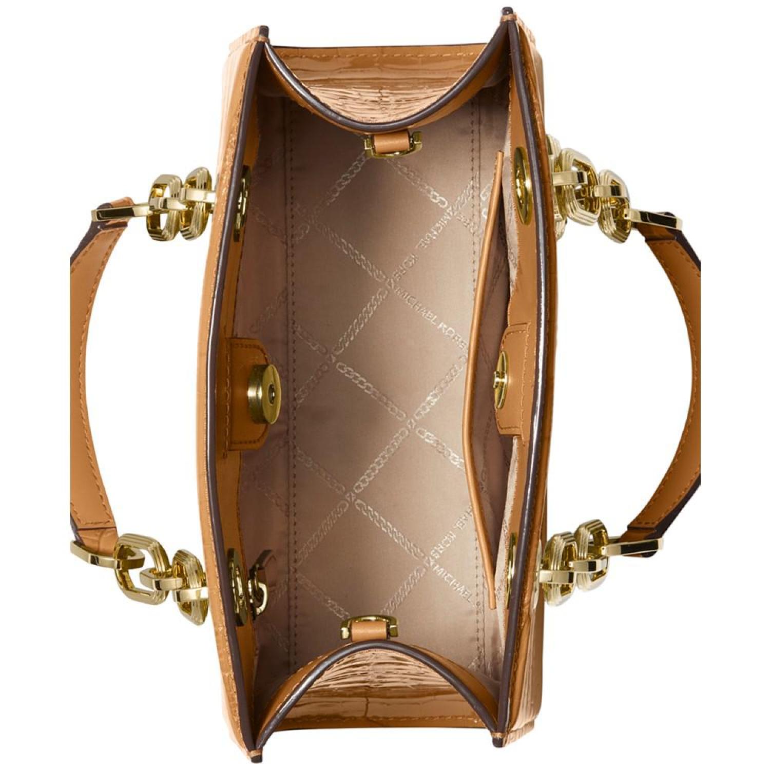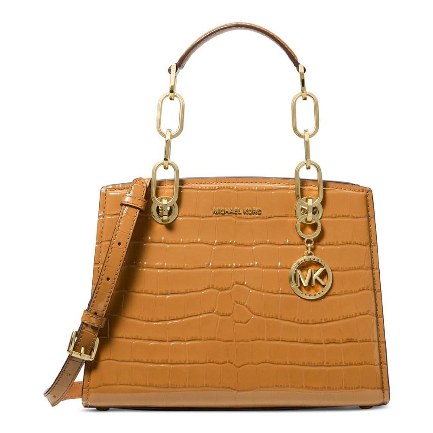 This satchel by MICHAEL Michael Kors brings sophistication to anything you pair it with. Crafted in leather, it features shiny gold-tone hardware and accents for a polished finish. Small sized bag; 10"W x 7"H x 4-1/4"D (width is measured across the bottom of handbag) Silhouette is based off 5'9" model 5"L handles; 24-1/2"L adjustable, removable strap Magnetic closure Gold-tone hardware, metal logo & charm Interior zip & slip pockets Leather; lining: polyester; trim: polyurethane, cotton, polyester Spot clean Imported