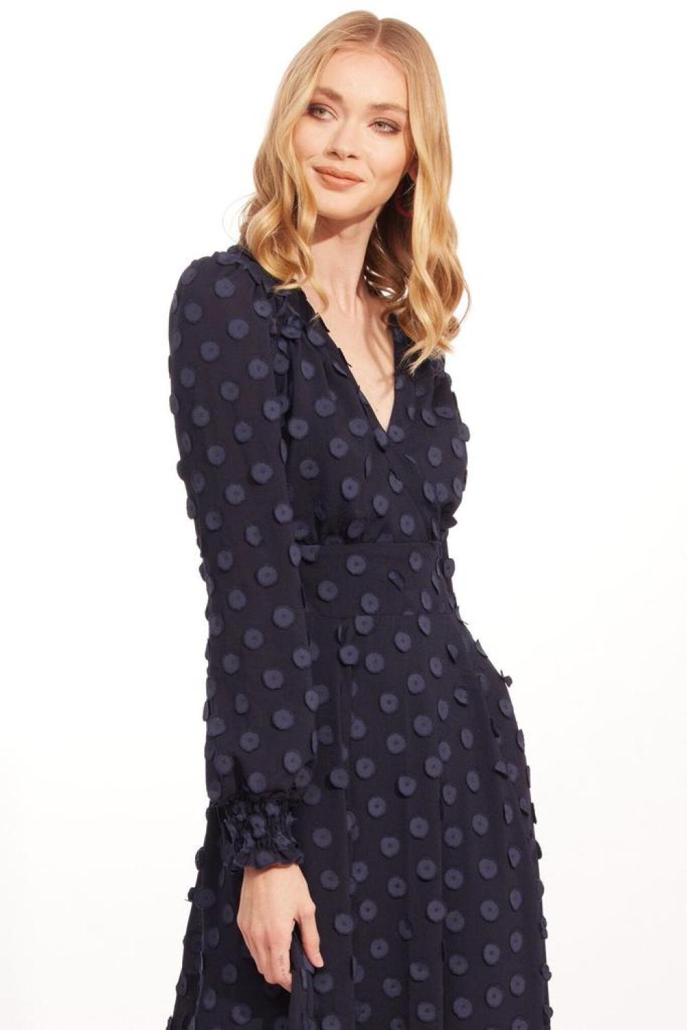 The Danielle Dress is a dramatic maxi with a surplice bodice, long sleeves, a wide waistband and a sweeping full skirt. Our Sapphire Dot fabric is a show-stopping textured navy chiffon with 3D dots in a rich navy color. Midi-length V neck Back zipper 3D dots fabric Smocked sleeves Elastic waistband Fully lined 95% Polyester 5% Spandex Made in USA