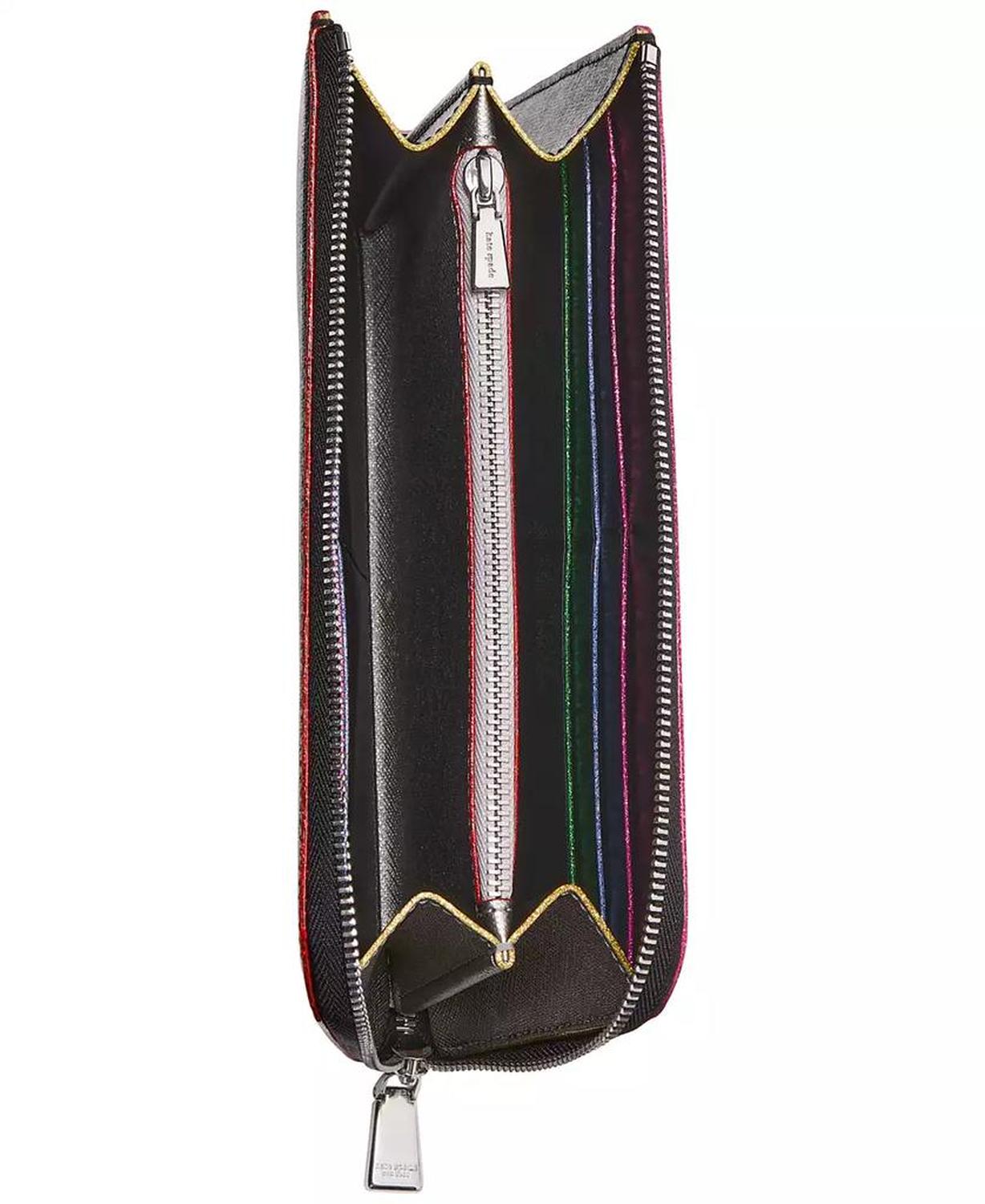 Reach for kate spade new york's sleek Devin continental wallet on repeat. It's made from scratch-resistant Saffiano leather, so it'll keep its glossy look for years to come. 7-2/3"W x 4-1/10"H x 1-1/10"D (width is measured across the bottom of wallet) Zip-around closure Silver-tone exterior hardware; interior zip pocket & 12 card slots 100% leather Spot clean