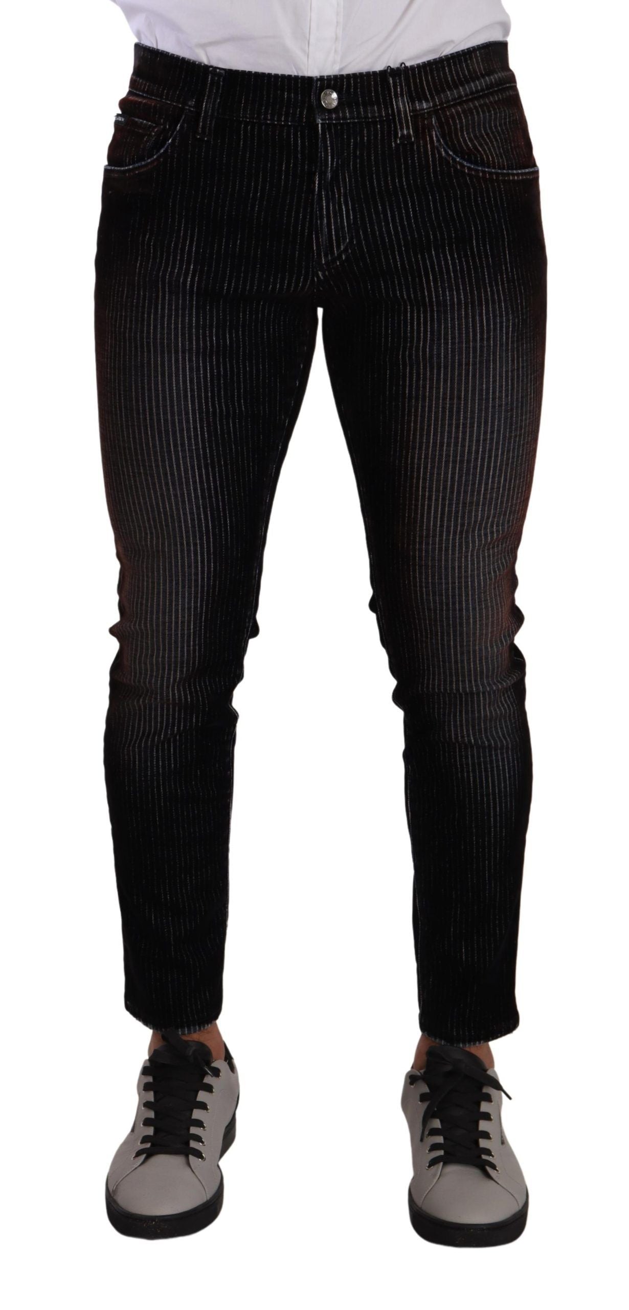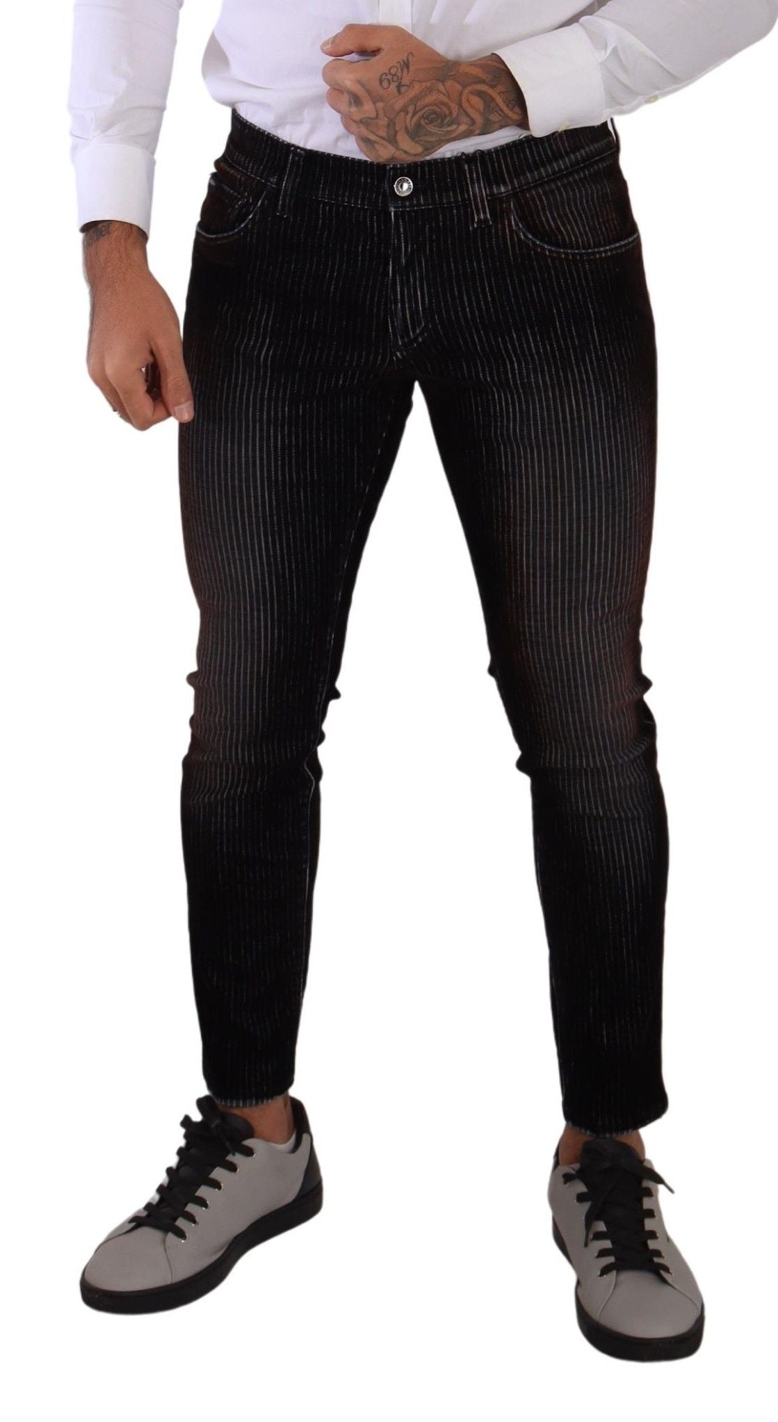 Step into luxury with these skinny denim jeans, exquisitely designed by Dolce & Gabbana. These jeans offer a sharp black washed striped aesthetic, providing a suave addition to your wardrobe. Perfect for those who appreciate fine tailoring and the allure of Italian craftsmanship, they feature a convenient zip and button closure, distinct logo details, and are made with a blend that offers comfort with a slim fit silhouette.