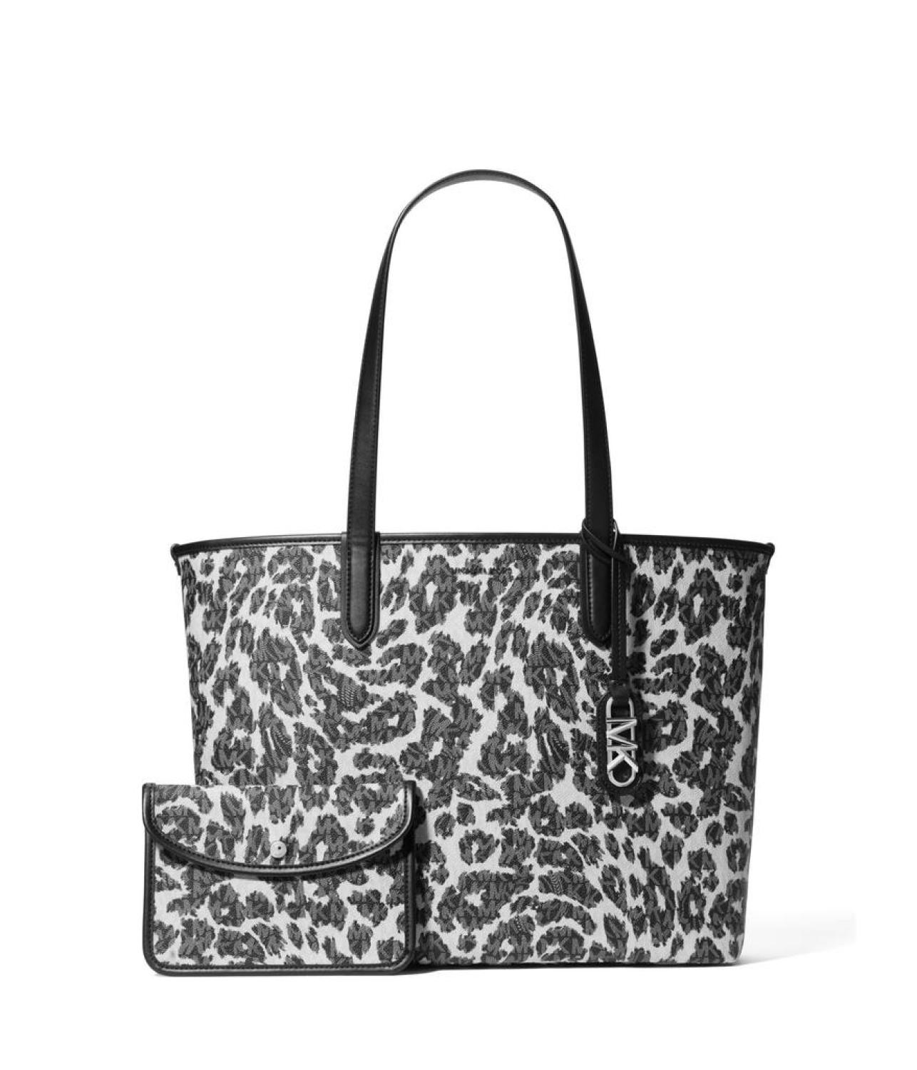 • Whether you're getting ready for work or going out shopping, the MICHAEL Michael Kors® Eliza Xl East West Tote is a perfect choice. The wide interior of the tote offers enough space for your stuff. Made from polyvinyl chloride to offer durability, this tote bag features an allover print that gives it a chic look. The dual shoulder straps make it convenient to carry around the bag. Lightweight and stylish, this printed tote is great for travel.