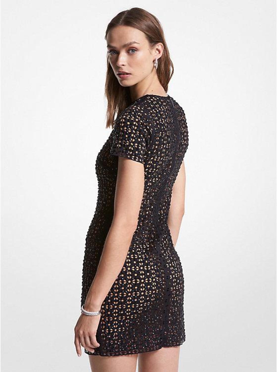 • Meet the dress that everyone is coveting this season. It’s designed from sporty scuba with a laser-cut geometric motif embellished with gemstones. Short sleeves and a mini length keep the silhouette simple yet distinct. Spotlight the intricate design with minimal accessories.