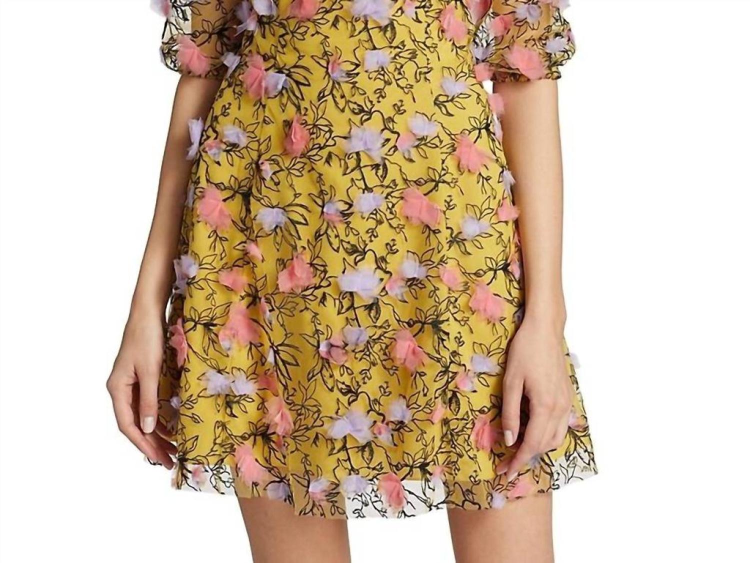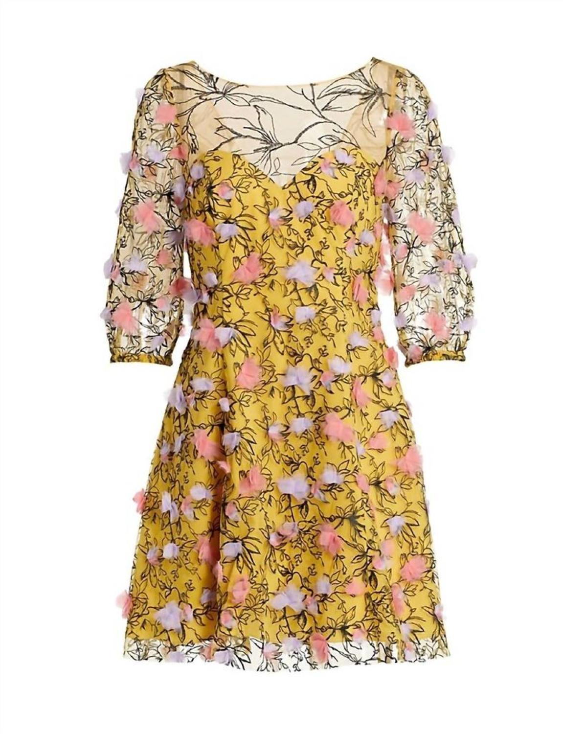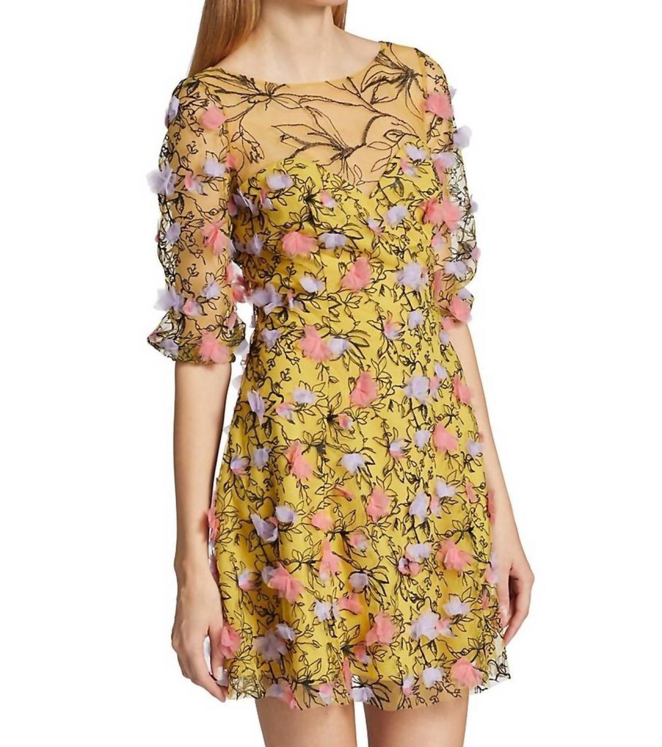 The kind of easy and flattering dress you'll be reaching for all season long.Features floral motif embroidery, demure sleeves, and a fit-and-flare silhouette. Boatneck. Three-quarter sleeves. Concealed back zipper. Nylon/polyester. Lining - Polyester. Dry clean only. About 35.5" from shoulder to hem. Model is 5'10" wearing a US size 4.
