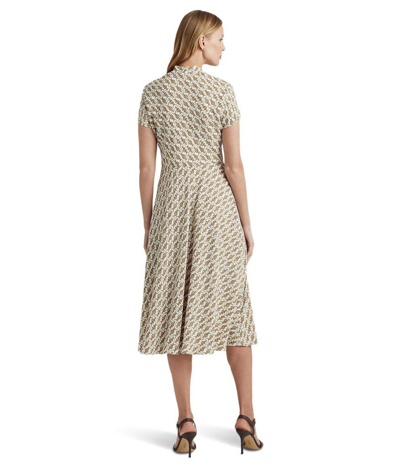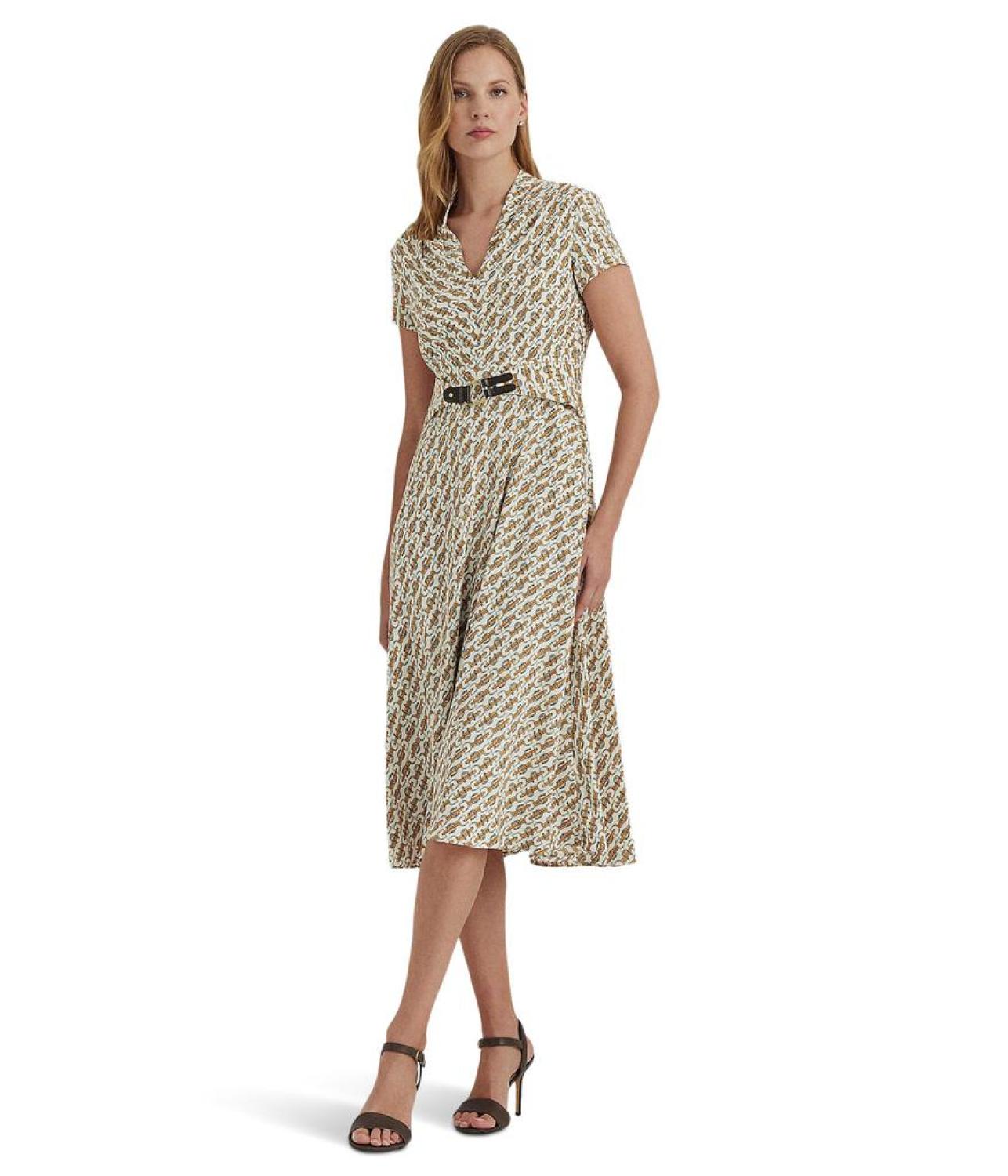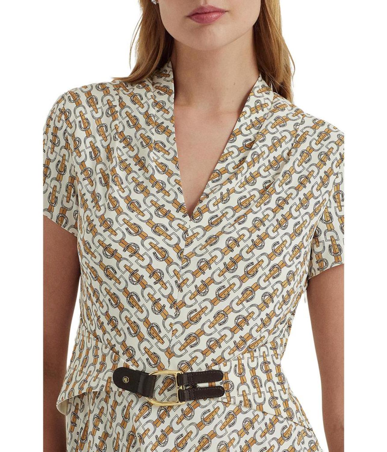 The primary materials that compose this product contain a minimum of 20 percent recycled content. Don the elegant look wearing the LAUREN Ralph Lauren® Equestrian-Print Georgette Dress. This short-sleeve dress features fit-and-flare silhouette, V-neckline with a band collar at the center back of the neck, concealed left-side-seam zipper with a hook-and-eye closure. It's self-extended panels gather into a faux-leather buckled tab at the center front of the waist. Lined bodice. Shell: 100% recycled polyester;Lining: 65% recycled polyester, 35% polyester. Hand wash. Imported.