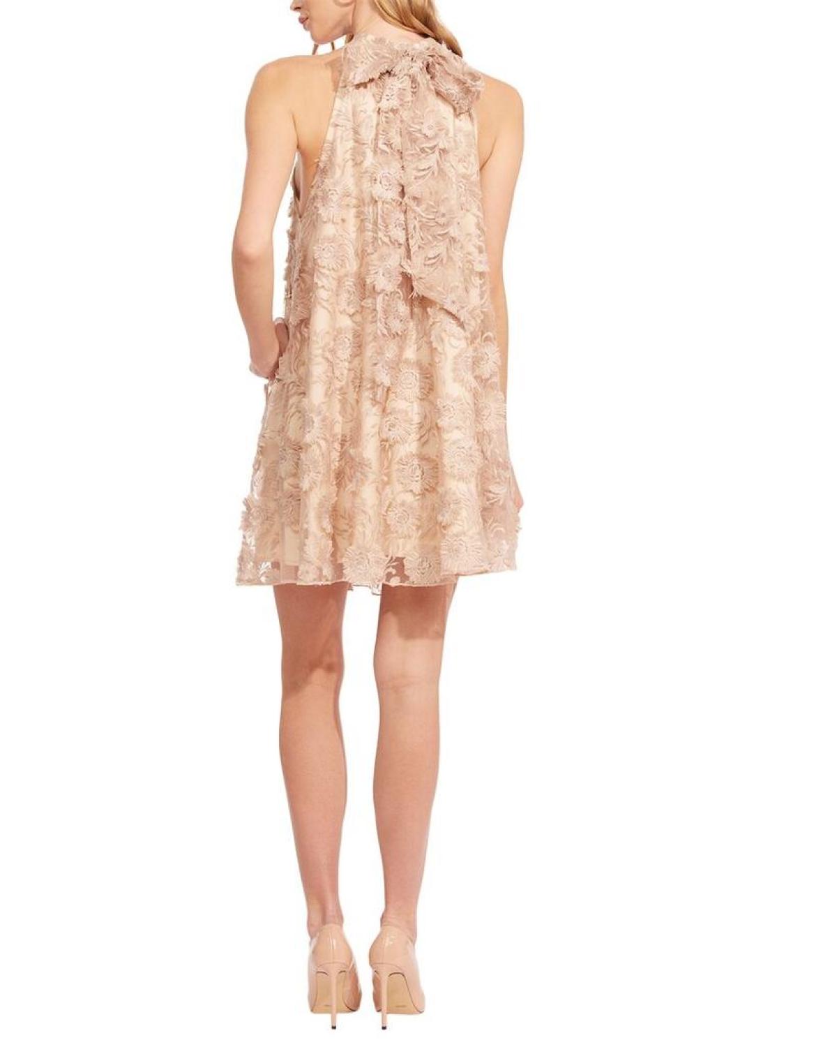 Introducing the stunning Eva Franco Henriette Mini Dress in Bloomsfield. This elegant swing silhouette dress features an embroidered mesh overlay, halter neck, and a halter neck tie in the back. Made from 100% polyester with a lining also made from 100% polyester, this dress is a must-have for any special occasion. Approximately 34.5 inches from shoulder to hem, this dress is designed to make you stand out. Dry clean only. Made in the USA.