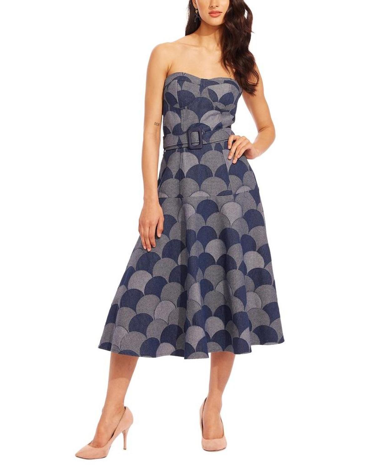 Introducing the stunning Eva Franco Mandoline Dress in Atomic Denim. This strapless fit and flare mini dress is the perfect addition to your wardrobe for any special occasion. Made in the USA from 100% cotton with a 100% polyester lining, this dress is both stylish and comfortable. The back zipper adds a touch of elegance while the approximately 51 inches from shoulder to hem creates a flattering silhouette. For best care, dry clean only. Elevate your look with the Eva Franco Mandoline Dress today!