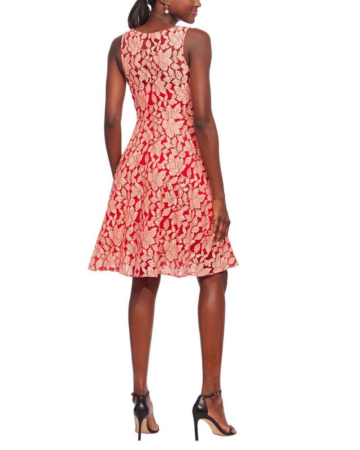 Introducing the Eva Franco Marsel Mini Dress, a stunning addition to your wardrobe. This fit and flare dress features a red and cream lace pattern that adds a touch of elegance to any occasion. The rounded neckline and center back zipper make this dress easy to slip on and off, while the 100% polyester lining ensures a comfortable fit. Approximately 40 inches from shoulder to hem, this mini dress is perfect for any special event. Made in the USA and dry clean only, this Eva Franco dress is a must-have for any fashion-forward woman.
