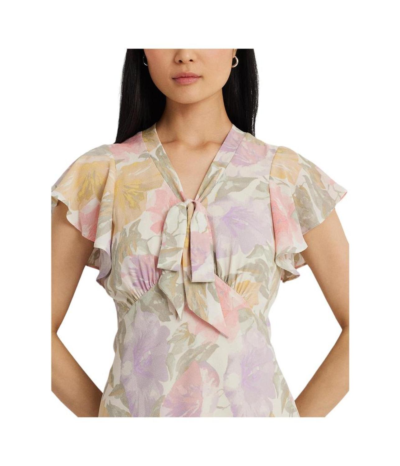 Short flutter sleeves and a V-neckline with a tie-neck accent.