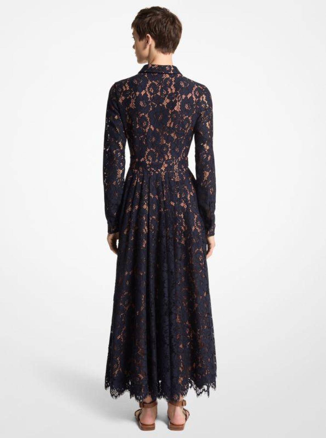• Irresistibly feminine, this Italian lace shirtdress balances modesty with modernity. A crisp point collar and covered placket accent a fitted bodice that descends into a full skirt. Ground it with luggage-hued flats for an essential daytime look.