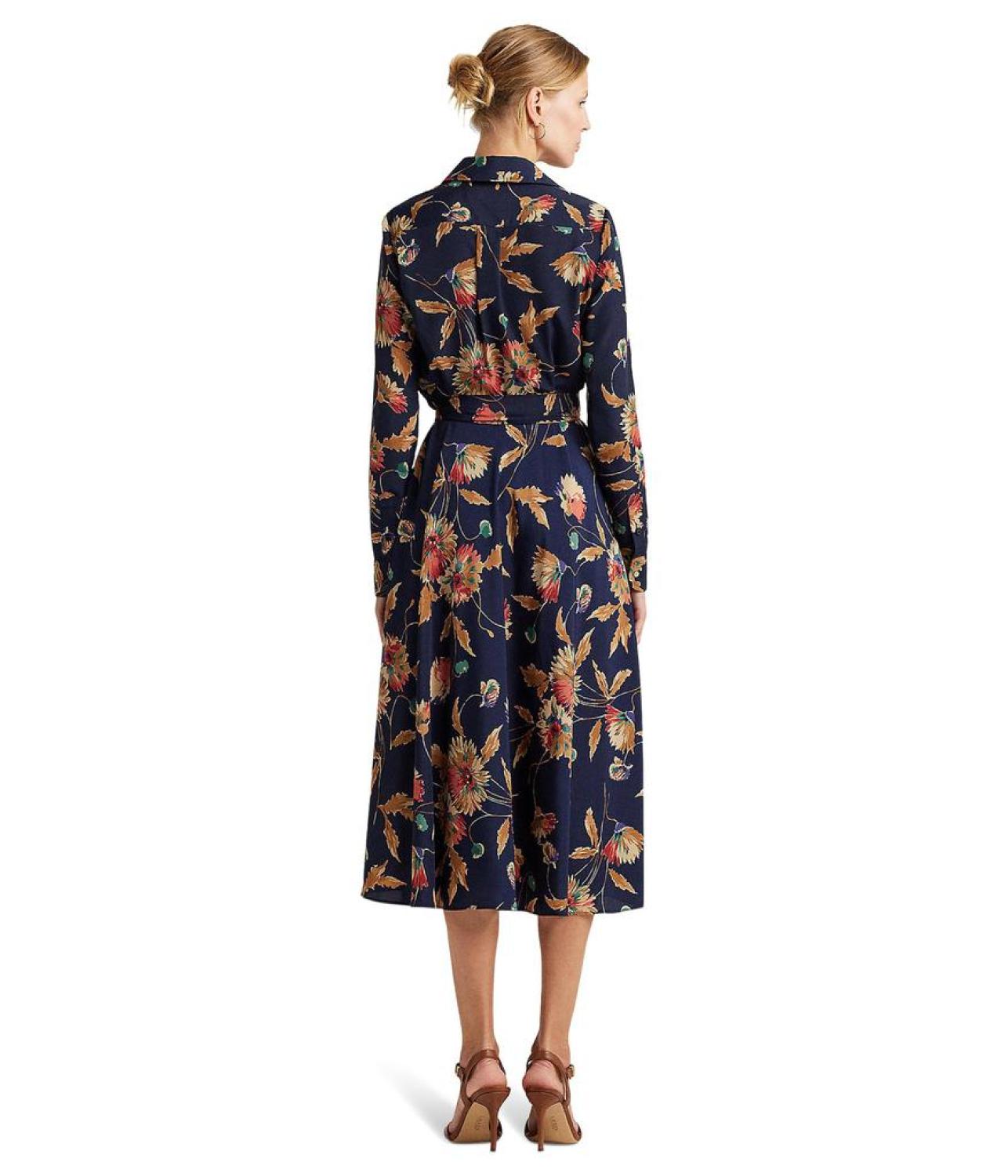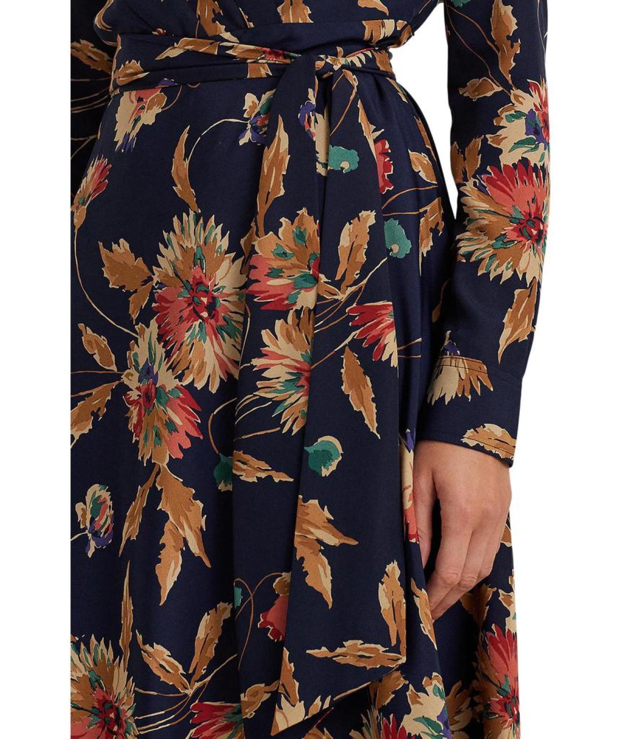 The LAUREN Ralph Lauren® Floral Surplice Crepe Midi Dress is exquisitely designed with a faux-wrap bodice and a belted waist for added sophistication. It features season's painterly floral motif, smooth crepe for a graceful drape, and a concealed left-side-seam zipper. The dress has a point collar, surplice neckline with a hook-and-eye closure, long sleeves with buttoned barrel cuffs "LRL"-engraved buttons, threaded belt loops, and a back yoke with back waist darts. It is intended to hit below the knee.