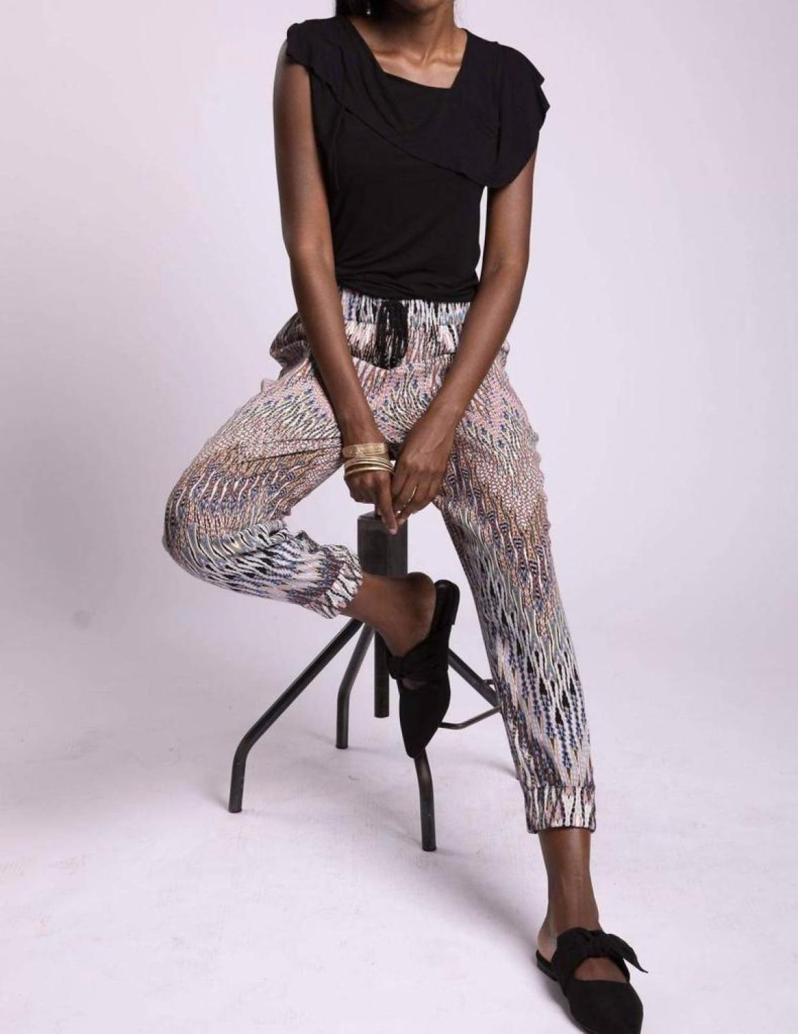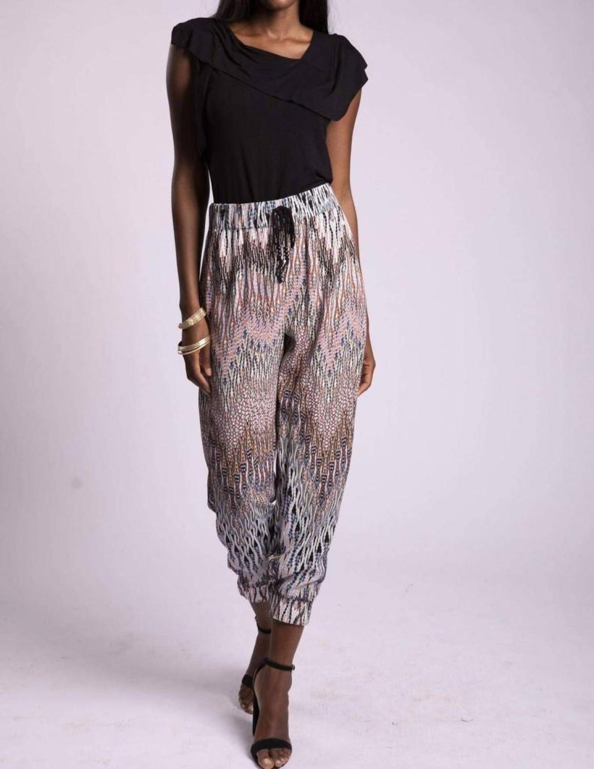 • The perfect pant for running around town and looking cool while doing it.This soft and lightweight patterned crepe feels silky and sleek. The multi-colored flame-stitch pattern is an eye catcher. Elastic waistband with drawstring tie for comfort and pull-on ease. Made in USA.
