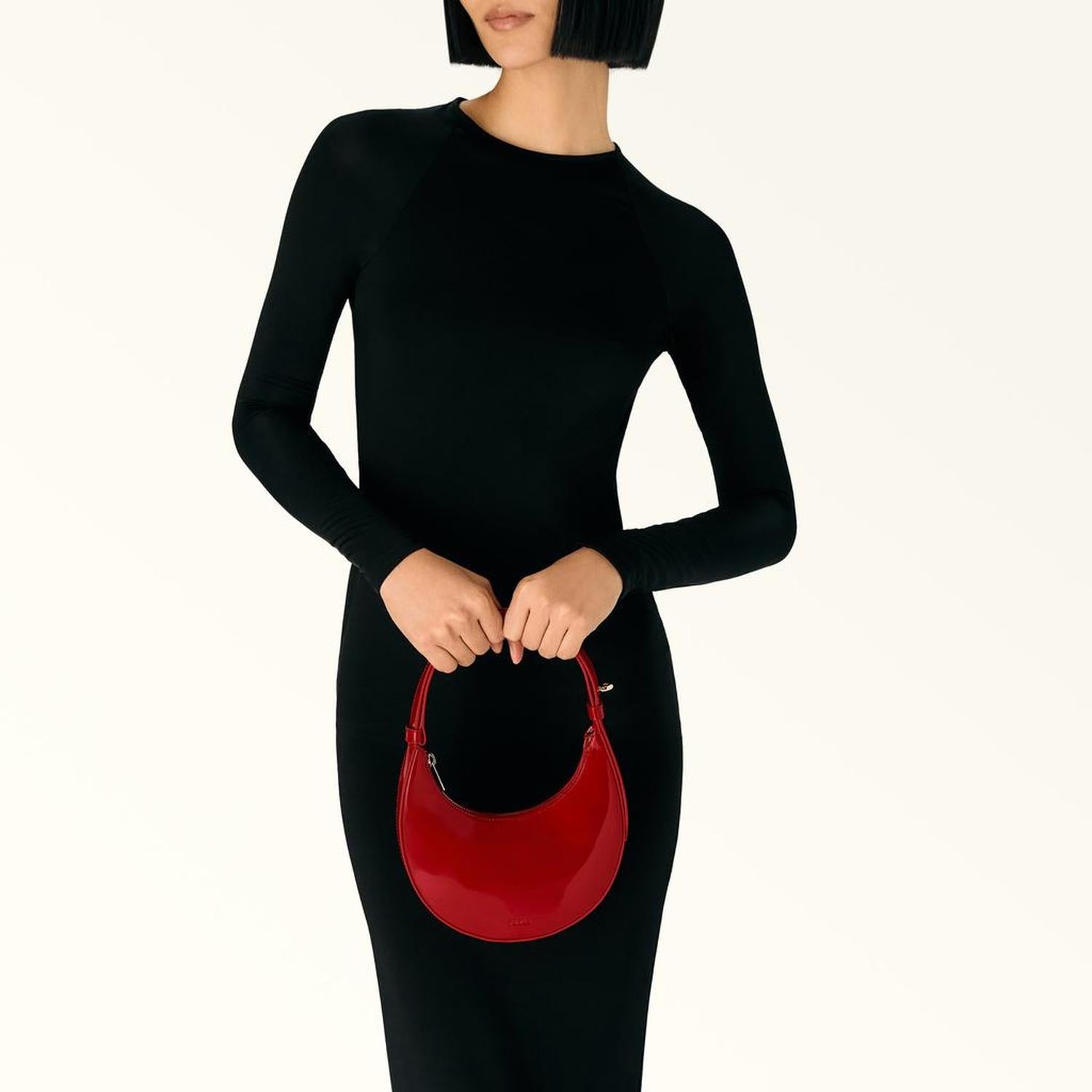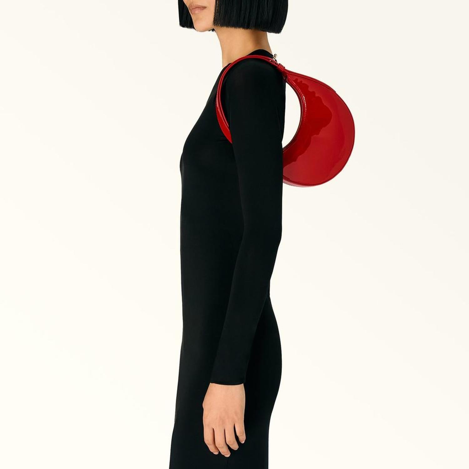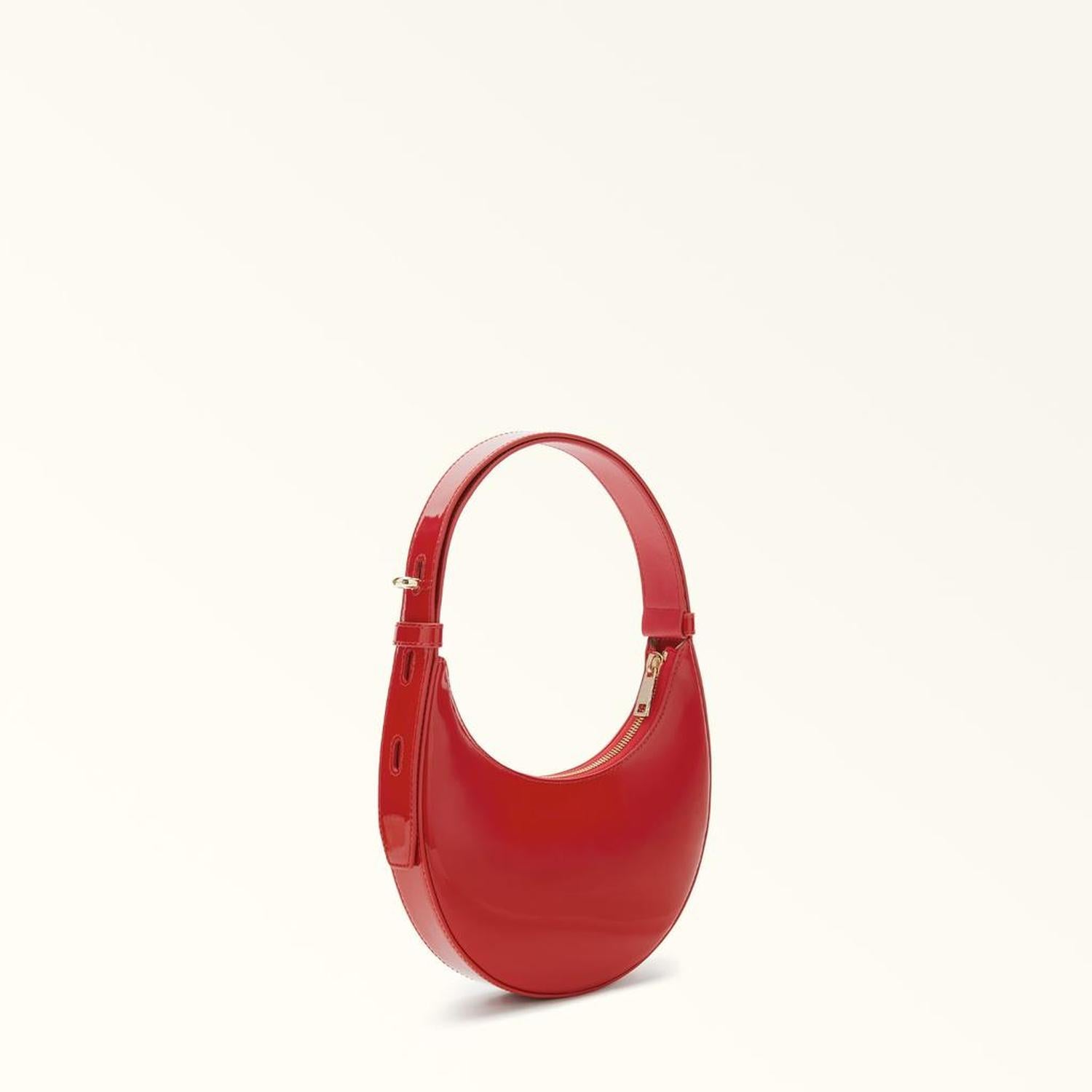 • With a rounded and lightweight half-moon silhouette, the mini Furla Delizia is a vibrant shoulder bag in glossy patent leather. Featuring an adjustable hard handle with oval holes, it sits perfectly under the arm when worn on the shoulder. Compact but spacious enough for storing all your essentials for the day.