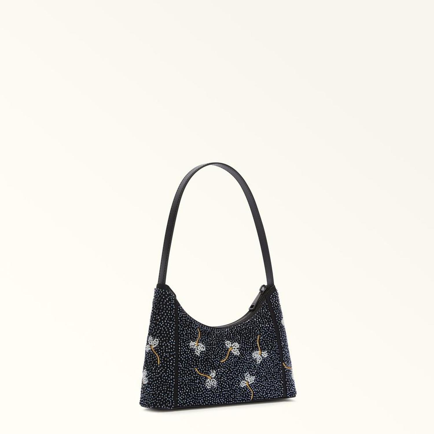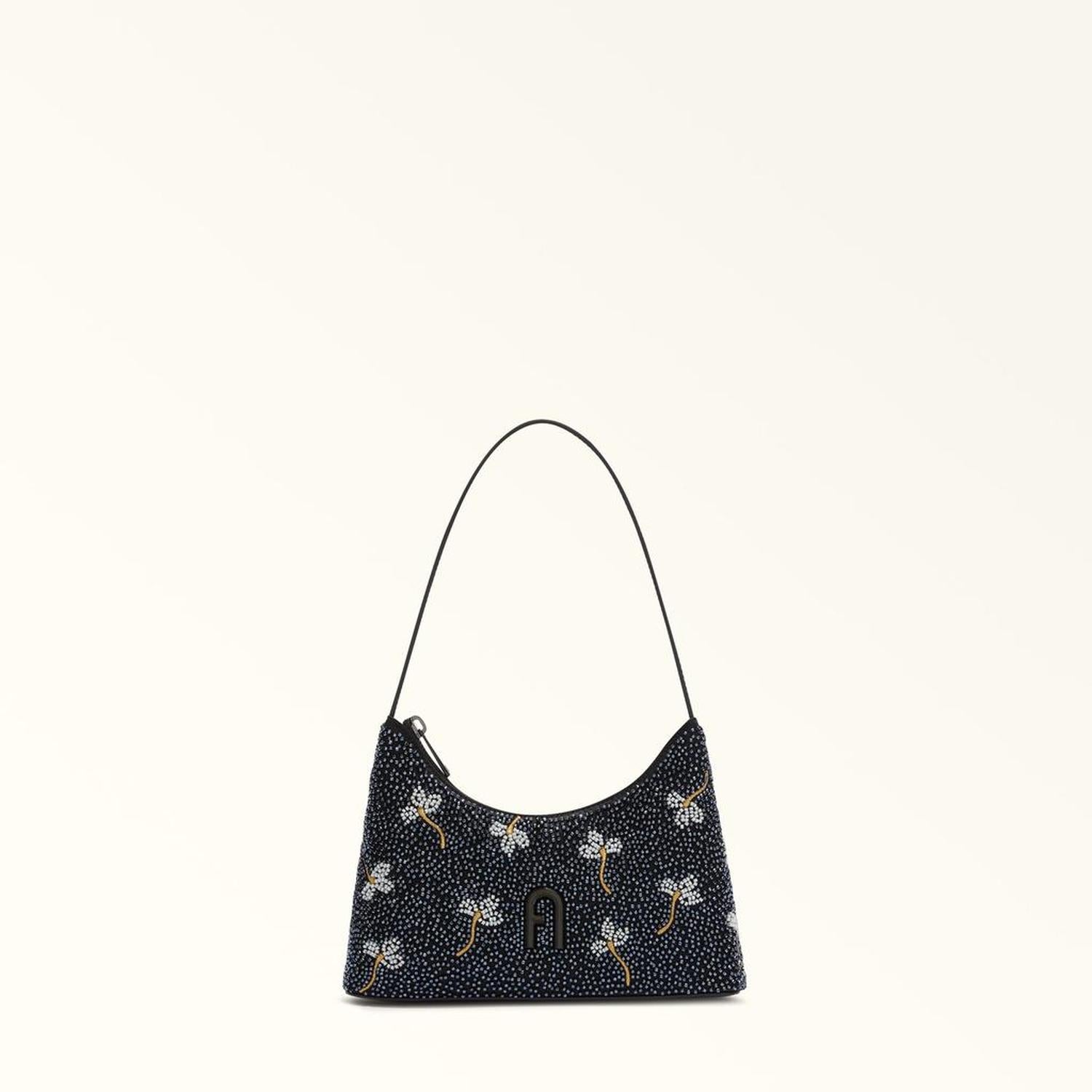 • Furla Diamante is the perfect mini shoulder bag to take you from the office to a night out, with its small size and sleek geometric lines. Crafted from sparkling glitter fabric, it elegantly holds all your small essentials, and stands out from the crowd with floral embroidery.